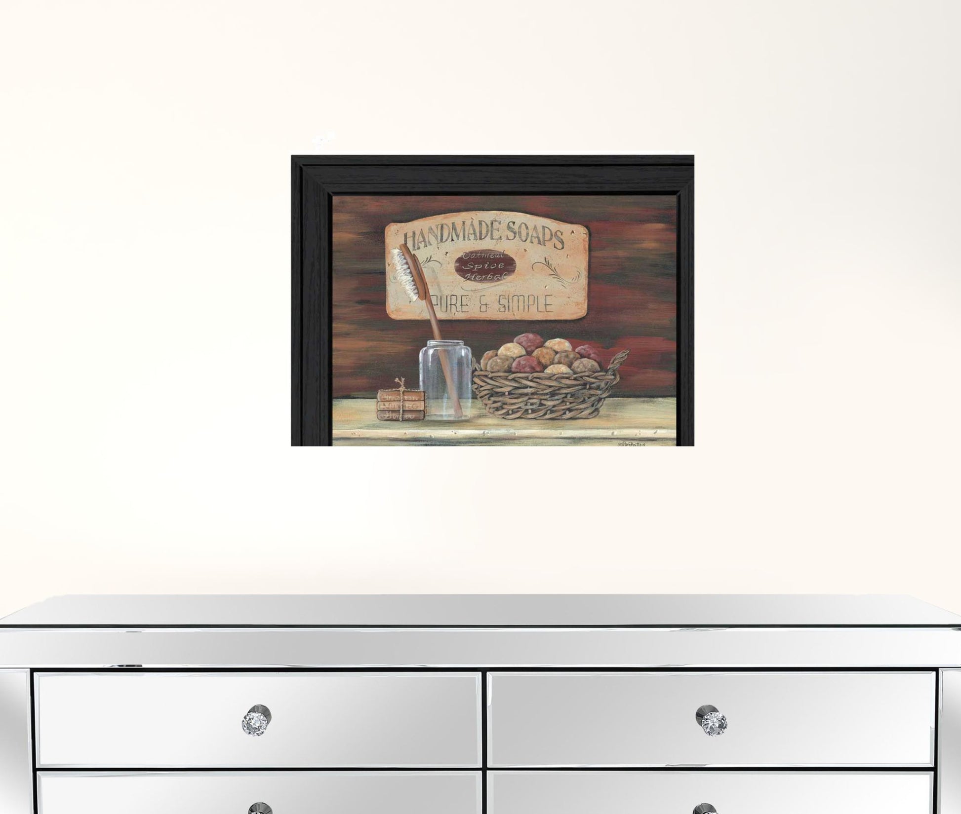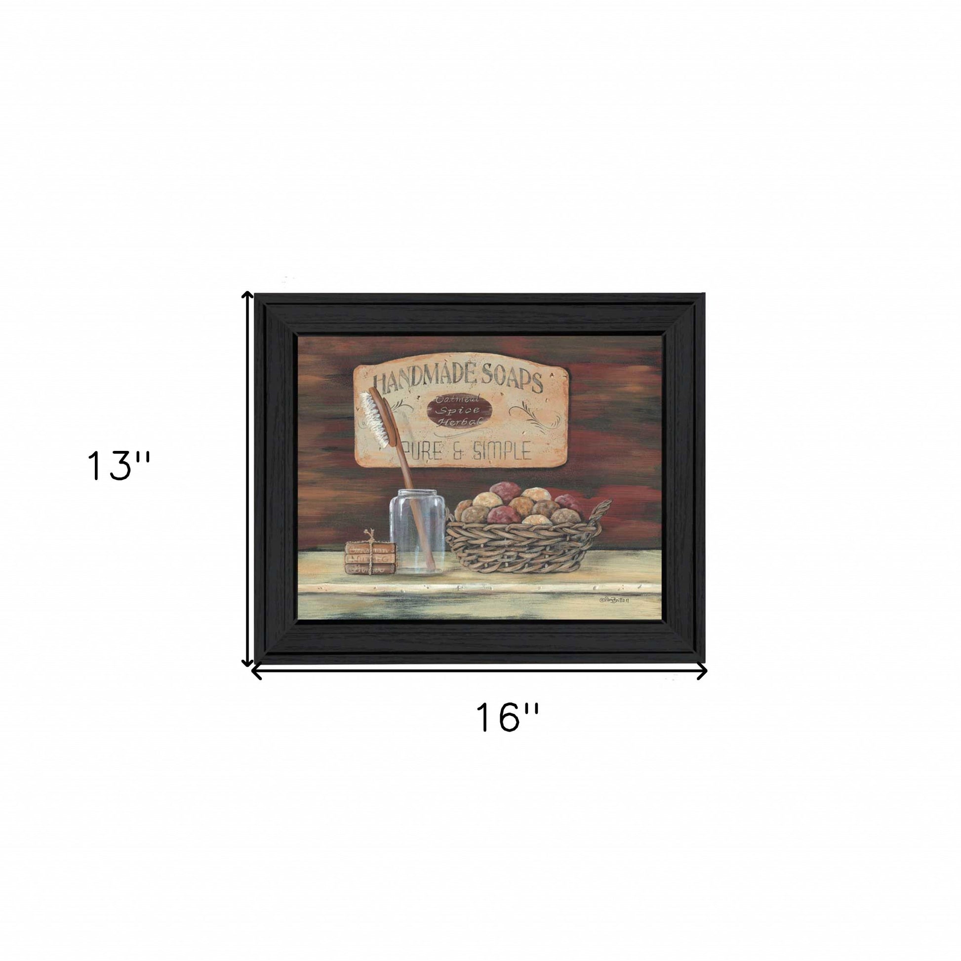 Unique and decorative, this handmade soaps 1 black framed print bathroom wall art will leave a lasting impression. This print is a visual artistic expression that allows you to decorate your space in style. Reproduced for you on paper, this hanging decorative accent will be a trendy and fashionable way to dress your walls. Adding this hanging wall art to your space to make your room feel more finished and attractive. Utilize this opportunity to create a focal point in the room with this fabulous wall decor option. 16 inches H x 13 inches W x 1 inches D