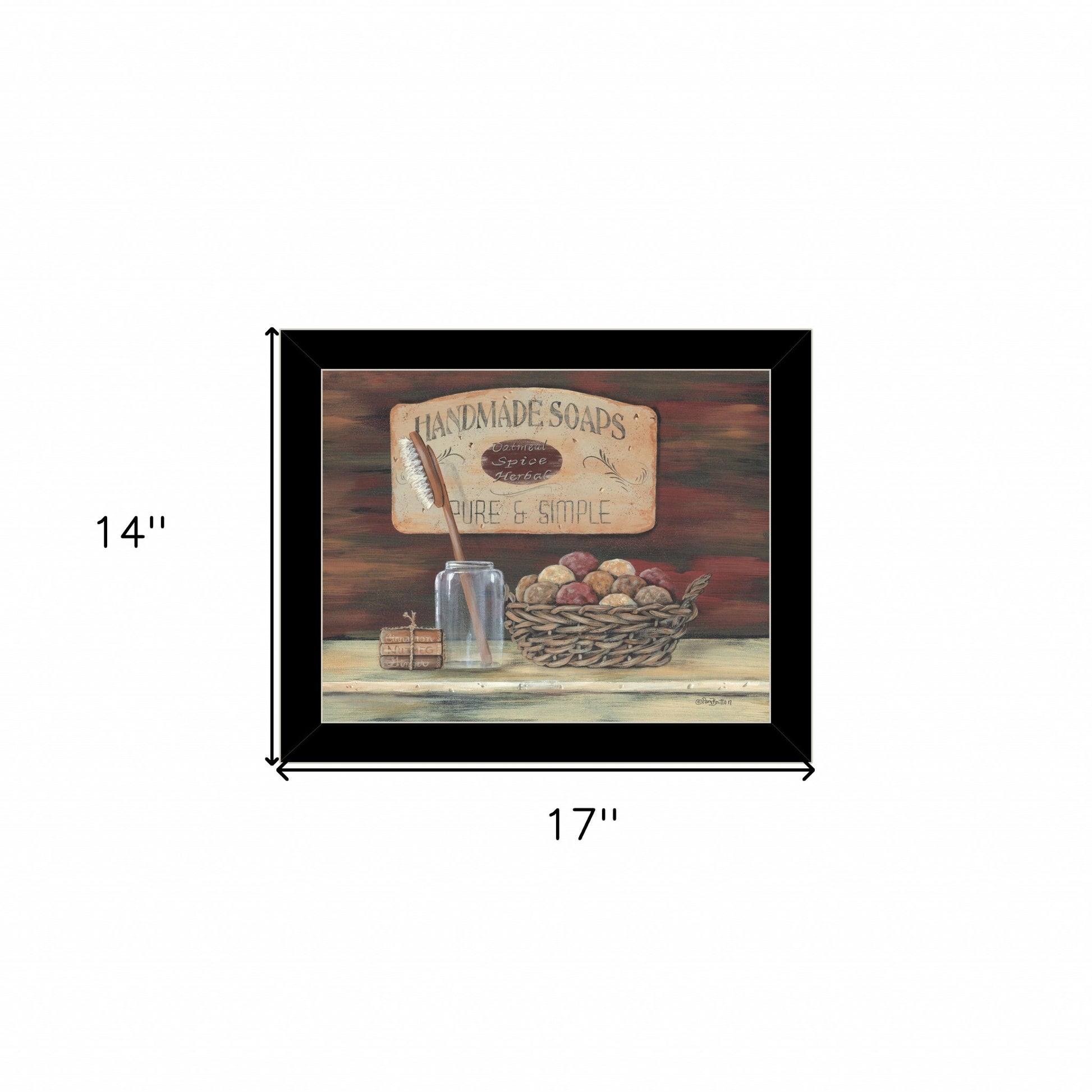 The handmade soaps 5 black framed print wall art is the perfect decorative accessory for your home. This print is a visual artistic expression that allows you to decorate your space in style. Reproduced for you on paper, this hanging decorative accent will be a trendy and fashionable way to dress your walls. Adding this hanging wall art to your space to make your room feel more finished and attractive. Utilize this opportunity to create a focal point in the room with this fabulous wall decor option. 14 inches H x 17 inches W x 1 inches D