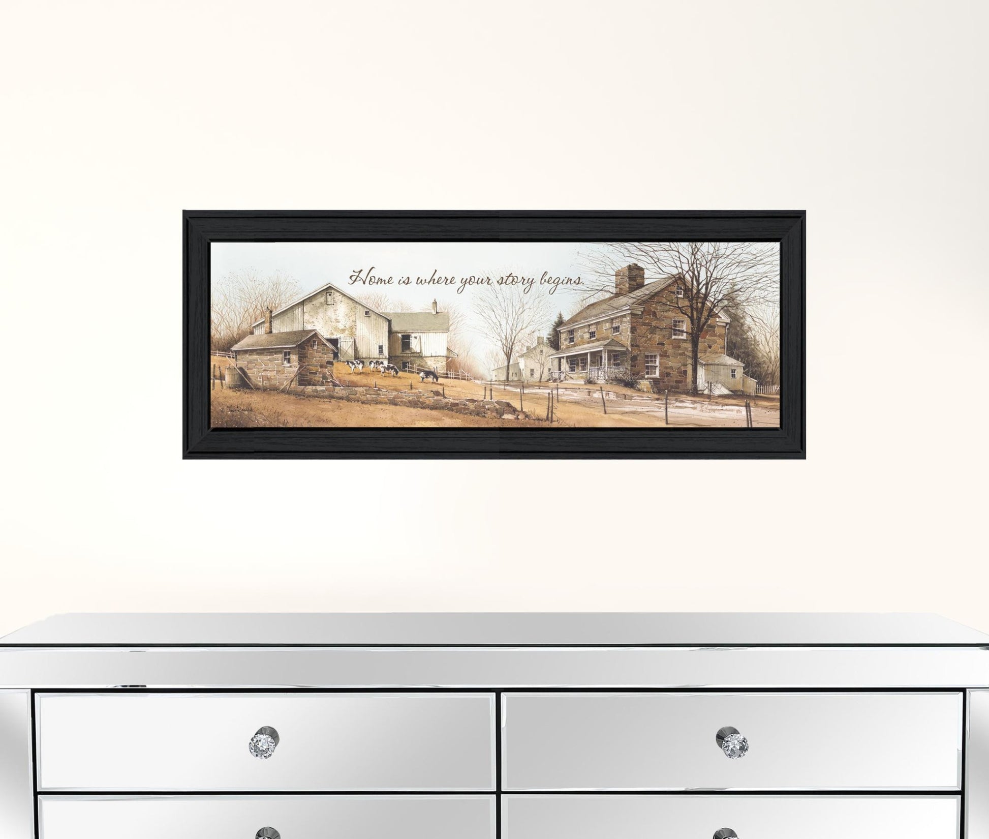 Unique and decorative, this home begins your story black framed print wall art will leave a lasting impression. This print is a visual artistic expression that allows you to decorate your space in style. Reproduced for you on paper, this hanging decorative accent will be a trendy and fashionable way to dress your walls. Hang on your wall to add some up to date fashion and decoration. Utilize this opportunity to create a focal point in the room with this fabulous wall decor option. 9 inches H x 21 inches W x 1 inches D