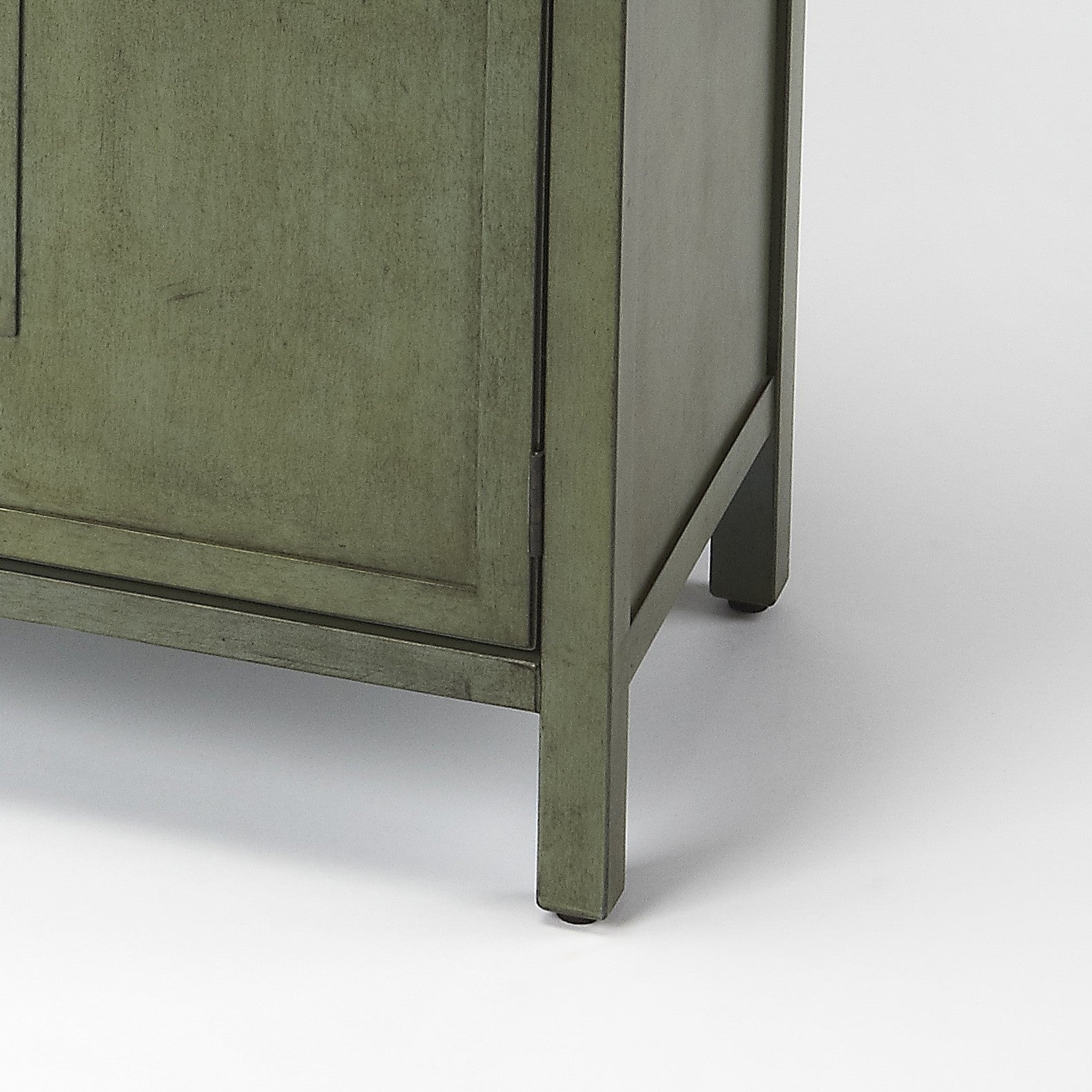 This stylish console cabinet combines Modern minimalism with Eastern design elements. Featuring clean lines and a green finish reminiscent of a Japanese Zen garden, its inner storage cabinet and two drawers make it a great addition in an entryway, hallway or living room. Crafted from bayur wood solids and wood products with nickel finished hardware.