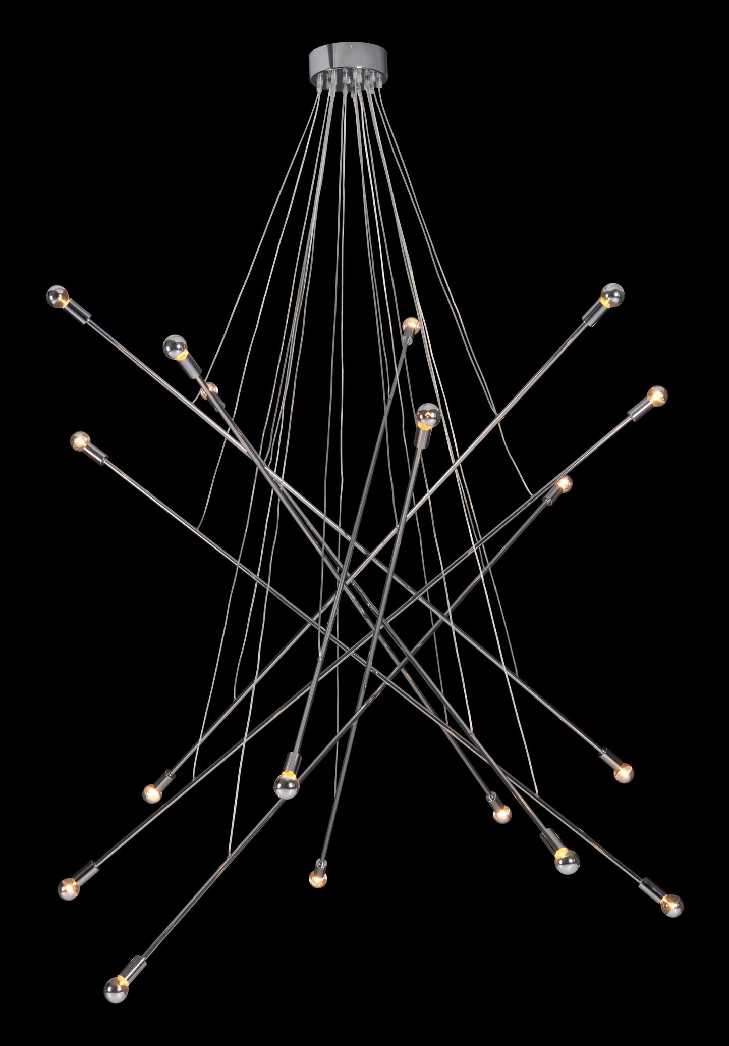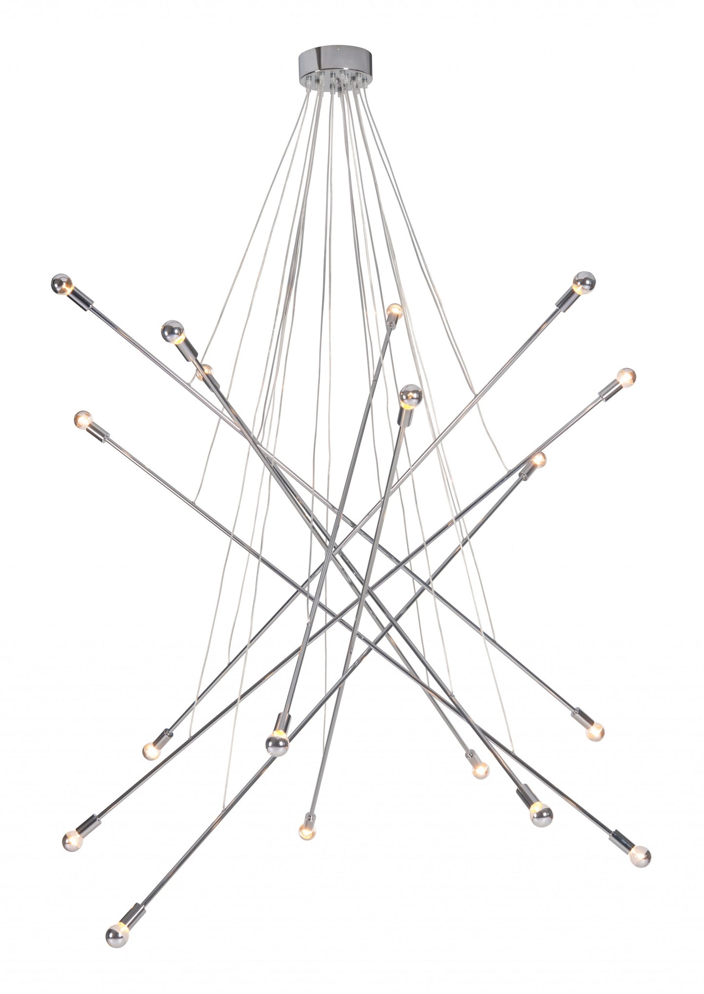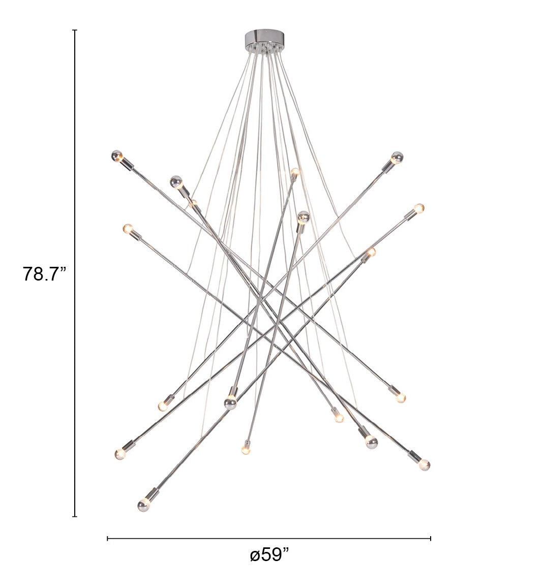 This Intersected Ceiling Lamp elegantly floats from the ceiling in an intriguing modern fashion. Chrome metal frame and arms with clear woven synthetic wire to give it it’s angles. This piece of art is a real eye catcher that has the ability to light up any space in a ravishing manner. 78.7” H x 59.0” W x 59.0” D