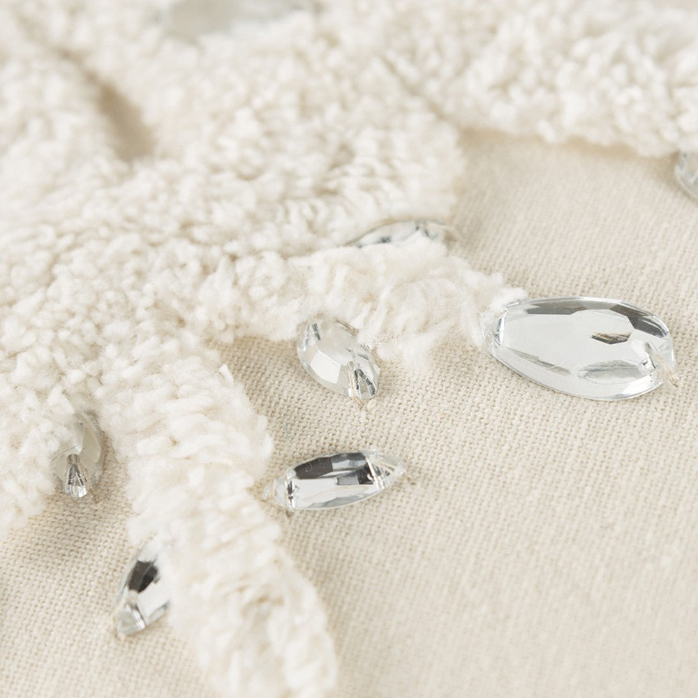 Add a hint of lux to your holiday space with this Ivory Glam Snowlfake Trio Lumbar Decorative Throw Pillow. The natural ivory cotton casing features three textural embroidered snowflakes with silver sparkle faux crystals that really pop. Silver thread pipes around the edges giving this pillow an interesting luxury and natural feel at the same time. Versatile and festive for all winter, this pillow is shaped for low back lumbar comfort. The 14" x 20" rectangle features a solid back with a hidden zipper closure for convenience.