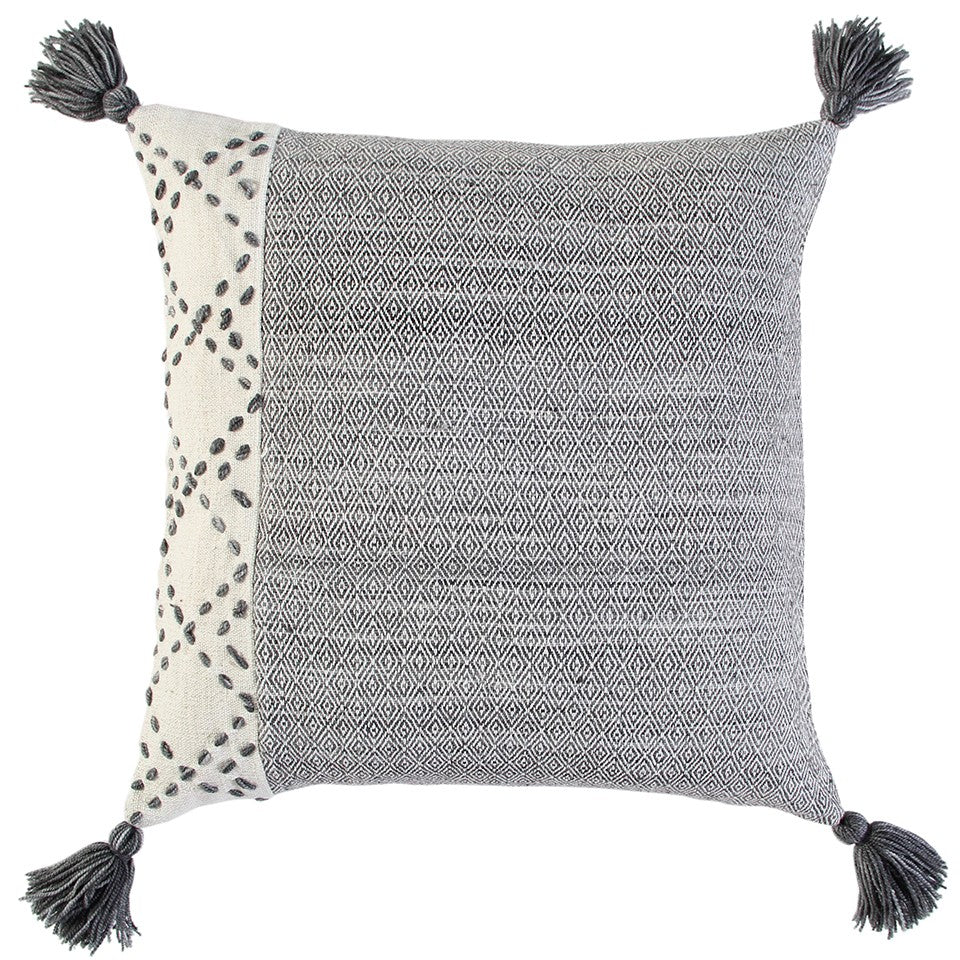 Bring a modern bohemian aesthetic to your living space with this sophisticatedly designed Ivory Gray Accent Stitch Color Block Throw Pillow. Featuring irregular color blocks with one side in distressed gray while the other sports a ivory base with gray-colored Kantha stitch in heavy diamond patterns for a stylish visual appeal. The four corner tassels add the beauty of the piece, giving it a subtle bohemian essence. Woven using fibers extruded from recycled plastic bottles, the pillow hosts fibers of different thicknesses to create the alluring base and embellishments. This poly-filled pillow is soft yet durable to provide maximum comfort while being an eye-catching piece to pair with your interior décor. The coordinating solid back features a hidden zipper closure for ease of cleaning. The simplicity and clean design of this artisanal throw pillow make it a worthy piece of décor to pair with any modern or bohemian interior. 20” x 20” x 6.25”
