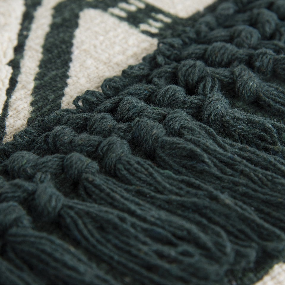 Spruce up your modern home with a hint of bohemian beauty as you introduce this Ivory Green Geometric Boho Chic Lumbar Pillow in the room. The alluring geometric patterns in pine green and ivory are beautifully embroidered to add texture to the cotton base while the macramé knotted fringe serves as an interesting accent on the pillow for visual appeal. Crafted from high-quality cotton fabric to ensure softness and durability while the polyfill insert gives a fluffy nature. The solid coordinating back bears a hidden zipper closure for easy cleaning. The stunning boho-chic artistry and cool-toned color palette of this decorative lumbar pillow will certainly evoke an organic atmosphere in your living space. 26” x 14” x 6.25”
