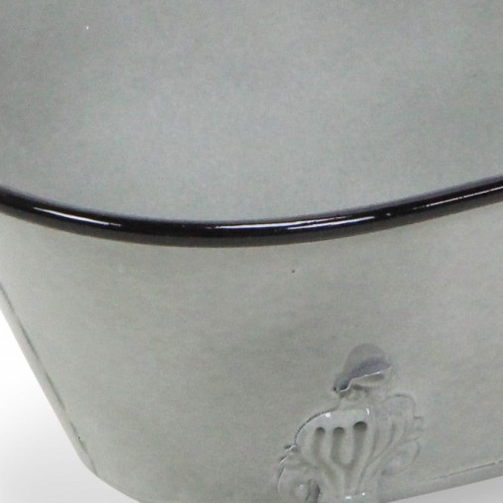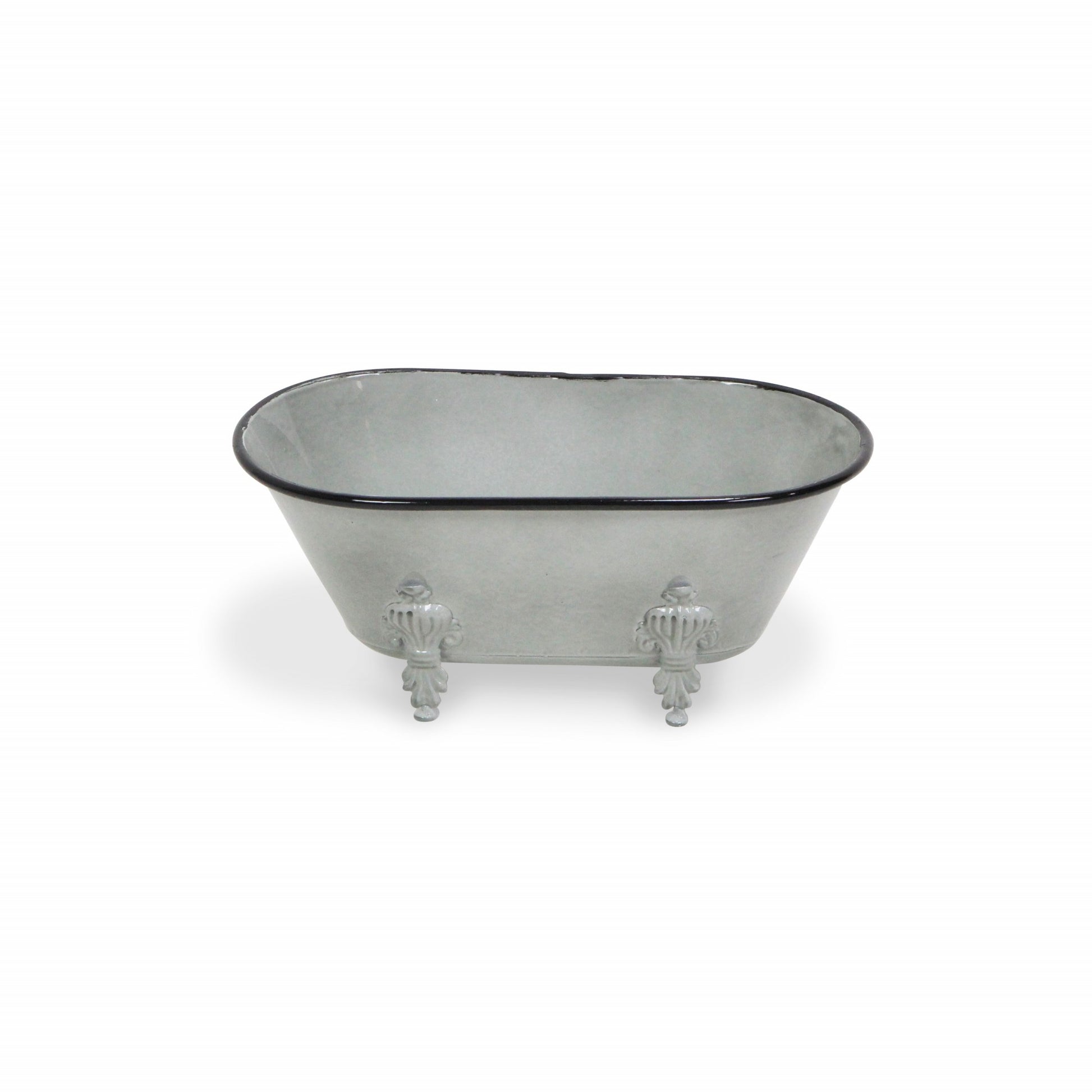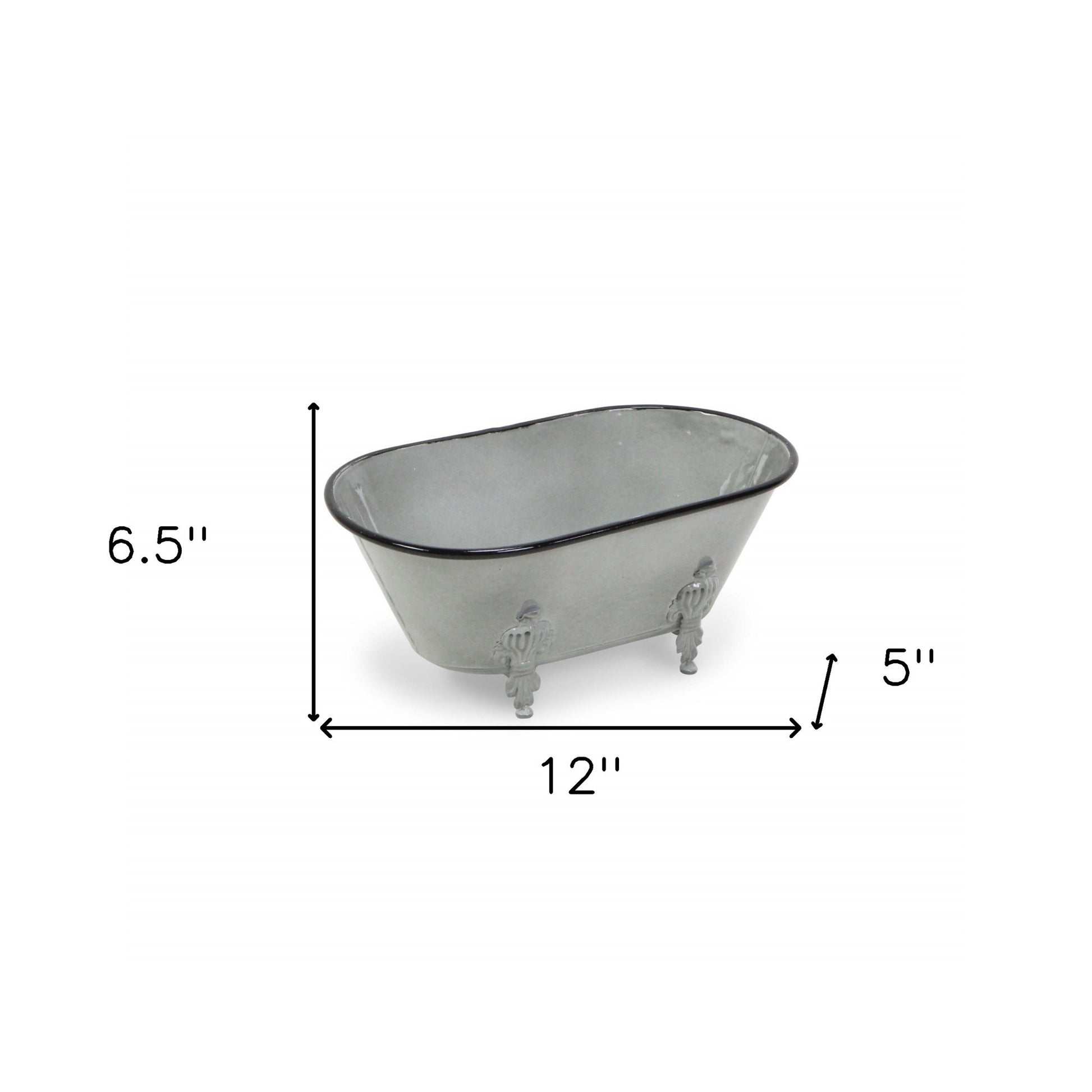 Add a whimsical touch to any space in your home with this Jumbo Light Gray Bathtub Decorative Sculpture. This piece is made from solid metal and is colored to a light gray finish. The claw foot bathtub shape has a black colored rim and four feet underneath which add a nice depth to the overall look. You can use this piece as decor around your home or you can line in with plastic and use it as a fun planter outdoors or indoors. 5" H x 12" W x 6.5" D