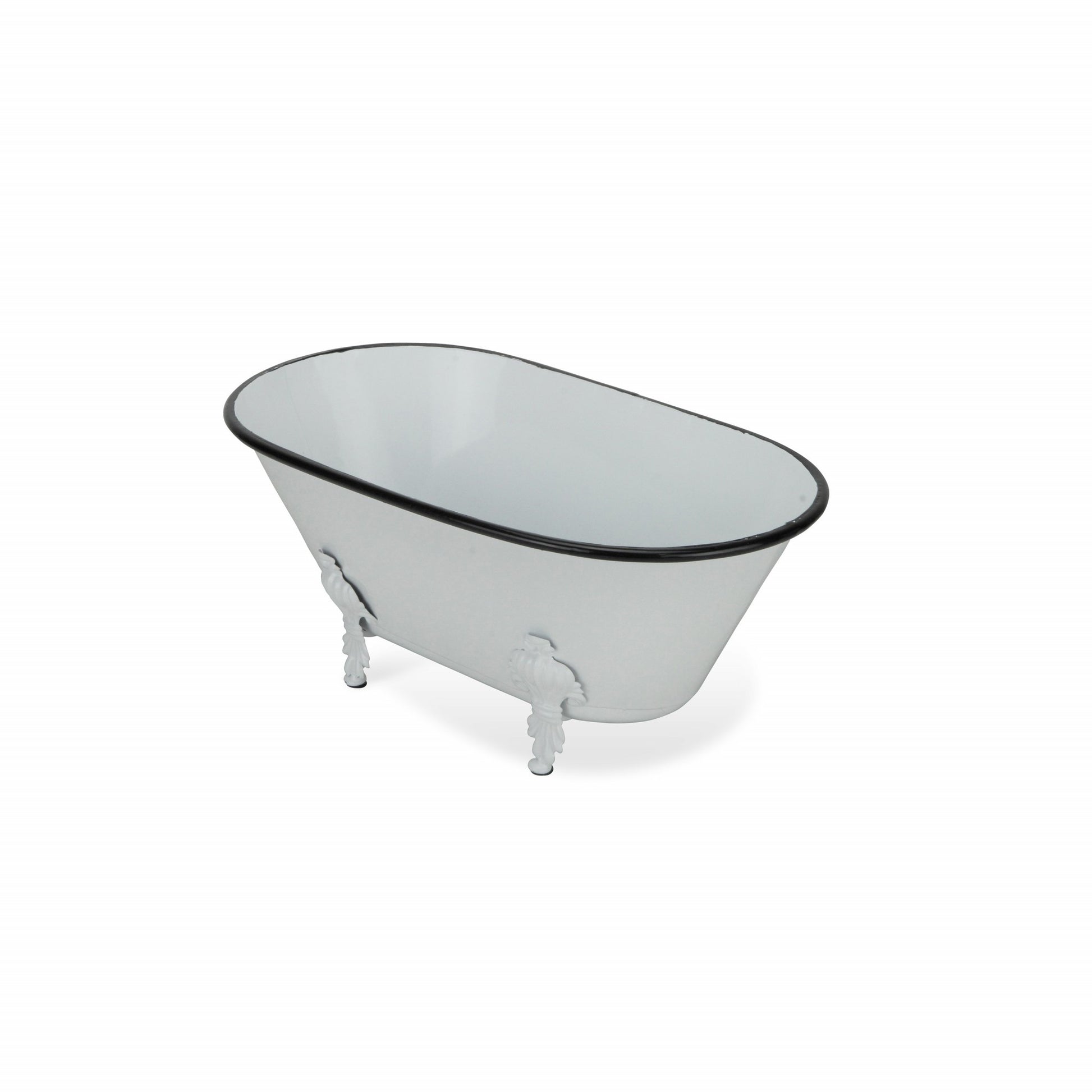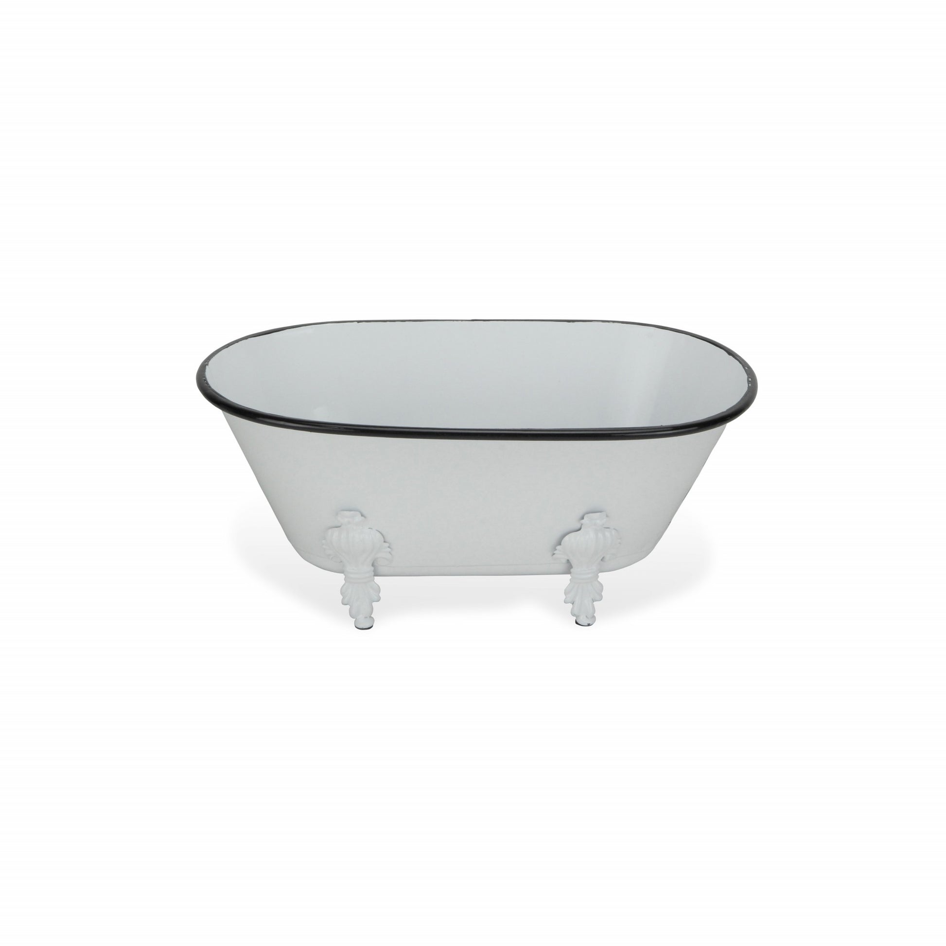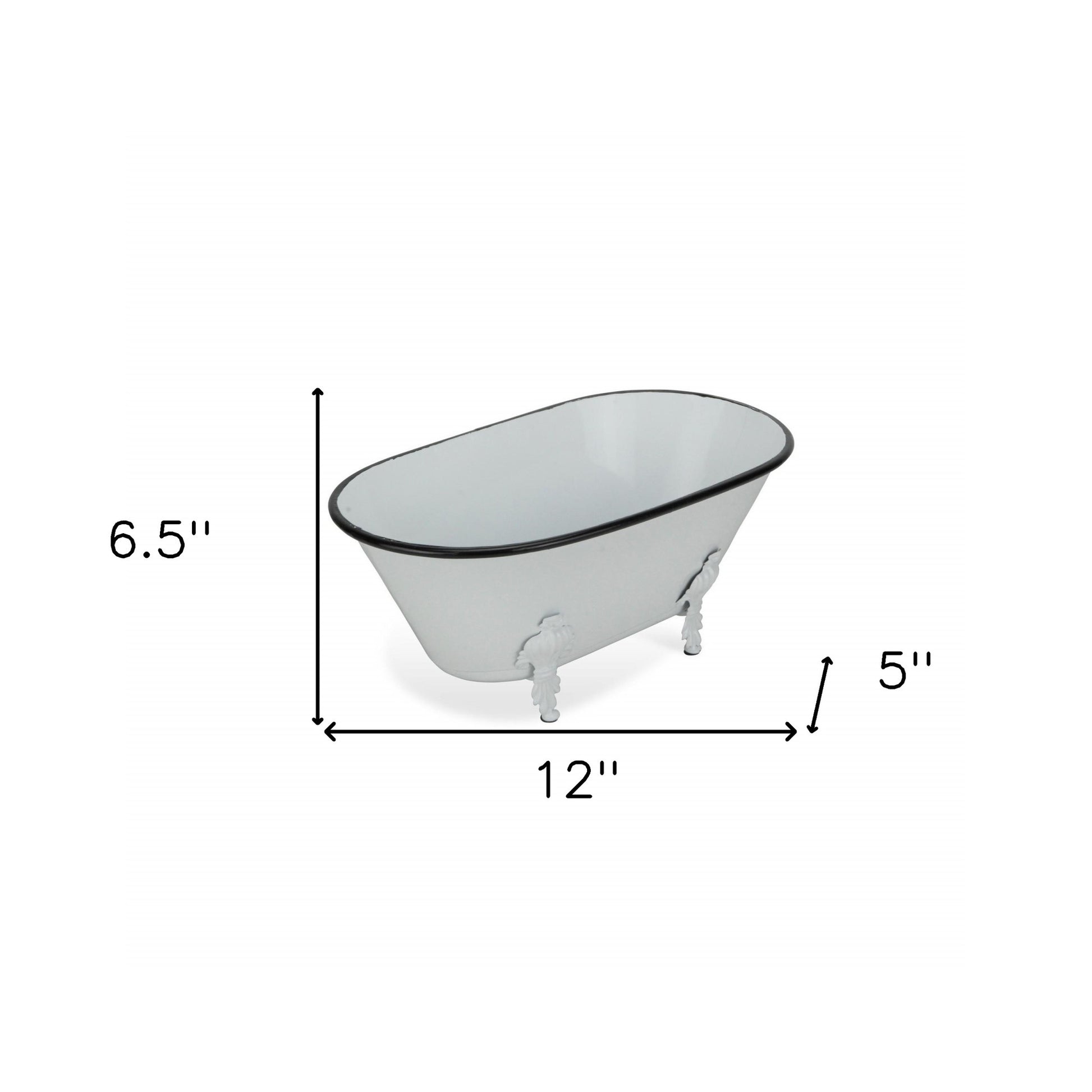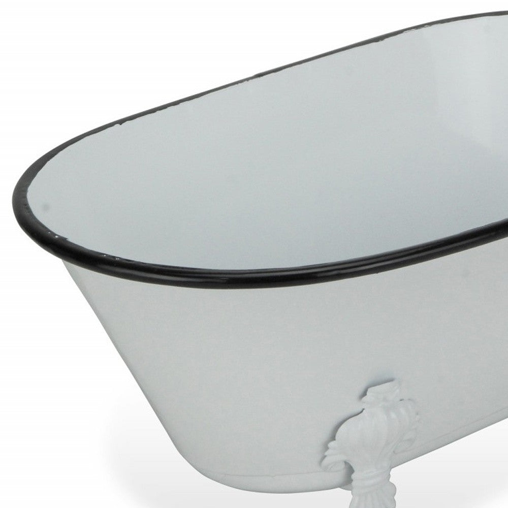 Add a whimsical touch to any space in your home with this Jumbo White Bathtub Decorative Sculpture. This piece is made from solid metal and is colored to a white finish. The claw foot bathtub shape has a black colored rim and four feet underneath which add a nice depth to the overall look. You can use this piece as decor around your home or you can line in with plastic and use it as a fun planter outdoors or indoors. 5" H x 12" W x 6.5" D