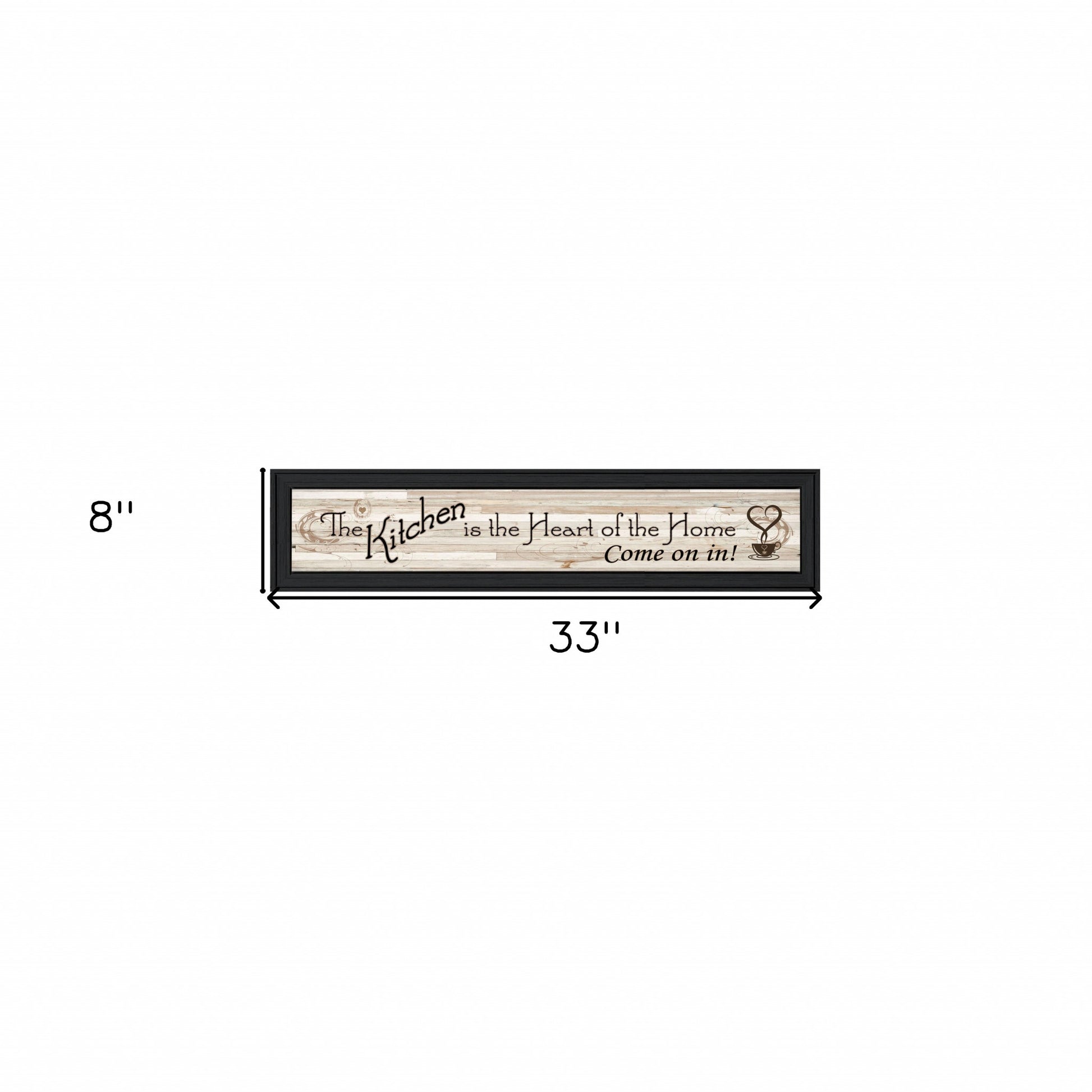 Unique and decorative, this kitchen is the heart of the home 1 black framed print wall art will leave a lasting impression. This print is a visual artistic expression that allows you to decorate your space in style. Reproduced for you on paper, this hanging decorative accent will be a trendy and fashionable way to dress your walls. Adding this hanging wall art to your space to make your room feel more finished and attractive. Instantly liven up your space with this art that brings color and dimension to your walls. 8 inches H x 33 inches W x 1 inches D