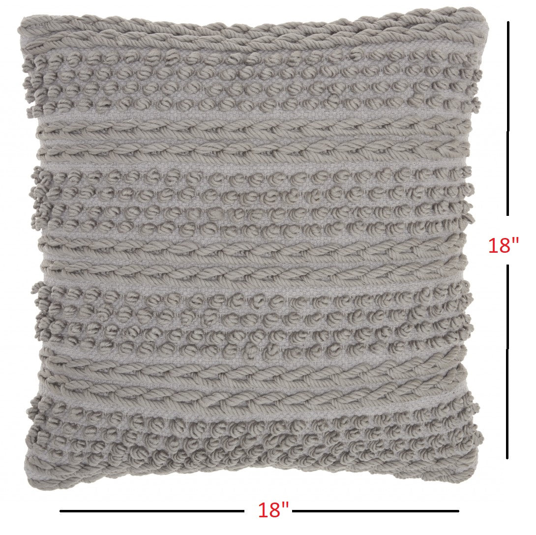 Set a calm and relaxing tone into your living space with this Light Gray Textured Dots and Stripes Throw Pillow that is bound to upgrade the aesthetics of any casual or contemporary setting. Featuring a single hued color palette, this pillow is designed in a classic textural pattern with braided stripes and raised pom-pom to create a fun yet luxurious appeal to the entire piece. Carefully crafted with 60% cotton and 40% polyester, this decorative pillow is not only durable and easy to clean but also feels super soft on the touch. This classy and cozy throw pillow will serve as a great ornate accent for your bed, sofa, or chair while harmonizing with the modern decors of your interior. 18” x 18” x 5”