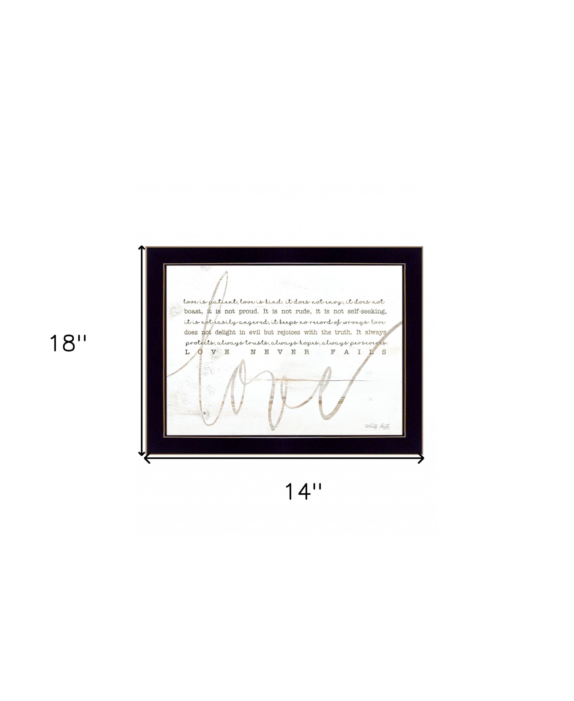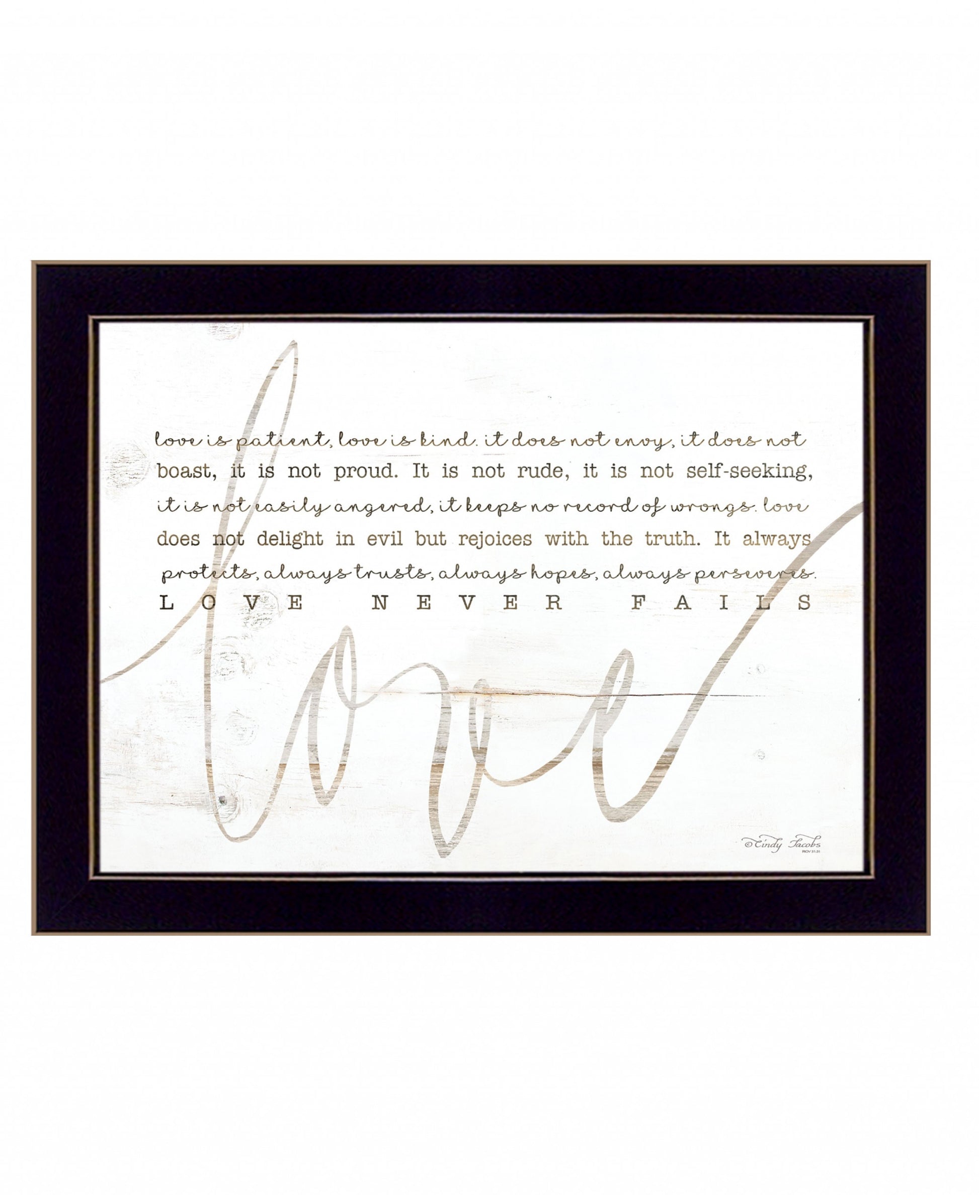Add an air of fashion to your room and rejuvenate the space with this love never fails 1 black framed print wall art. This print is a visual artistic expression that allows you to decorate your space in style. Reproduced for you on wood, this hanging decorative accent will be a trendy and fashionable way to dress your walls in a rustic and modern farmhouse vibe. Hang on your wall to add some up to date fashion and decoration. Utilize this opportunity to create a focal point in the room with this fabulous wall decor option. 14 inches H x 18 inches W x 1 inches D