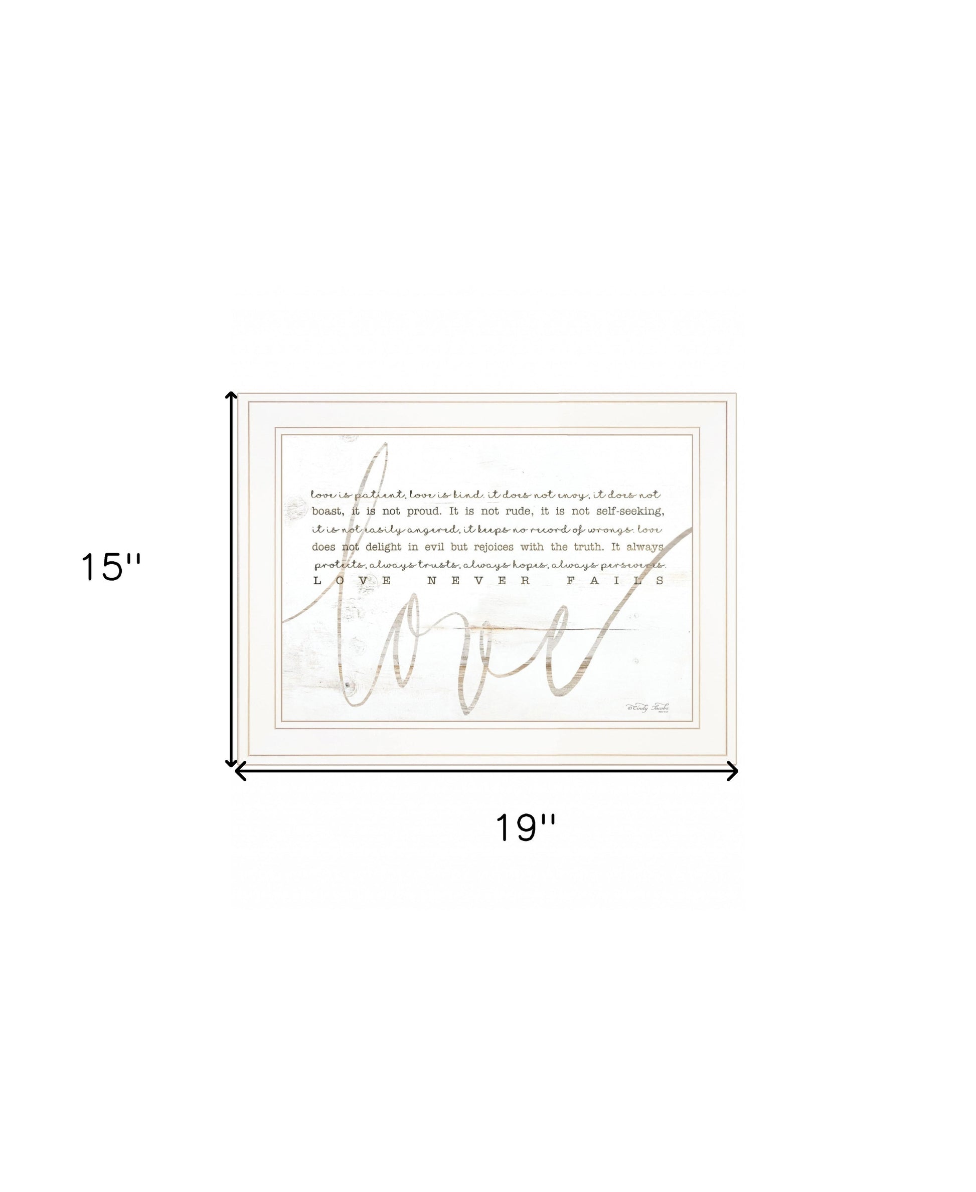 This love never fails 2 white framed print wall art will add a beautiful decorative accent to your decor. This print is a visual artistic expression that allows you to decorate your space in style. Reproduced for you on wood, this hanging decorative accent will be a trendy and fashionable way to dress your walls in a rustic and modern farmhouse vibe. Adding this hanging wall art to your space to make your room feel more finished and attractive. Utilize this opportunity to create a focal point in the room with this fabulous wall decor option. 15 inches H x 19 inches W x 1 inches D