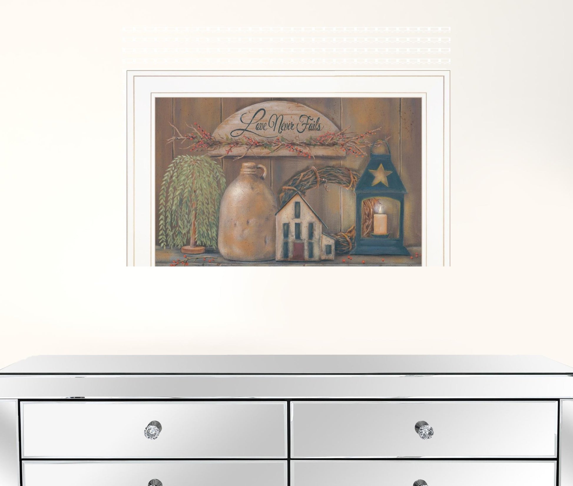 This love never fails 5 white framed print wall art will add a beautiful decorative accent to your decor. This print is a visual artistic expression that allows you to decorate your space in style. Reproduced for you on paper, this hanging decorative accent will be a trendy and fashionable way to dress your walls. Hang on your wall to add some up to date fashion and decoration. Utilize this opportunity to create a focal point in the room with this fabulous wall decor option. 15 inches H x 19 inches W x 1 inches D