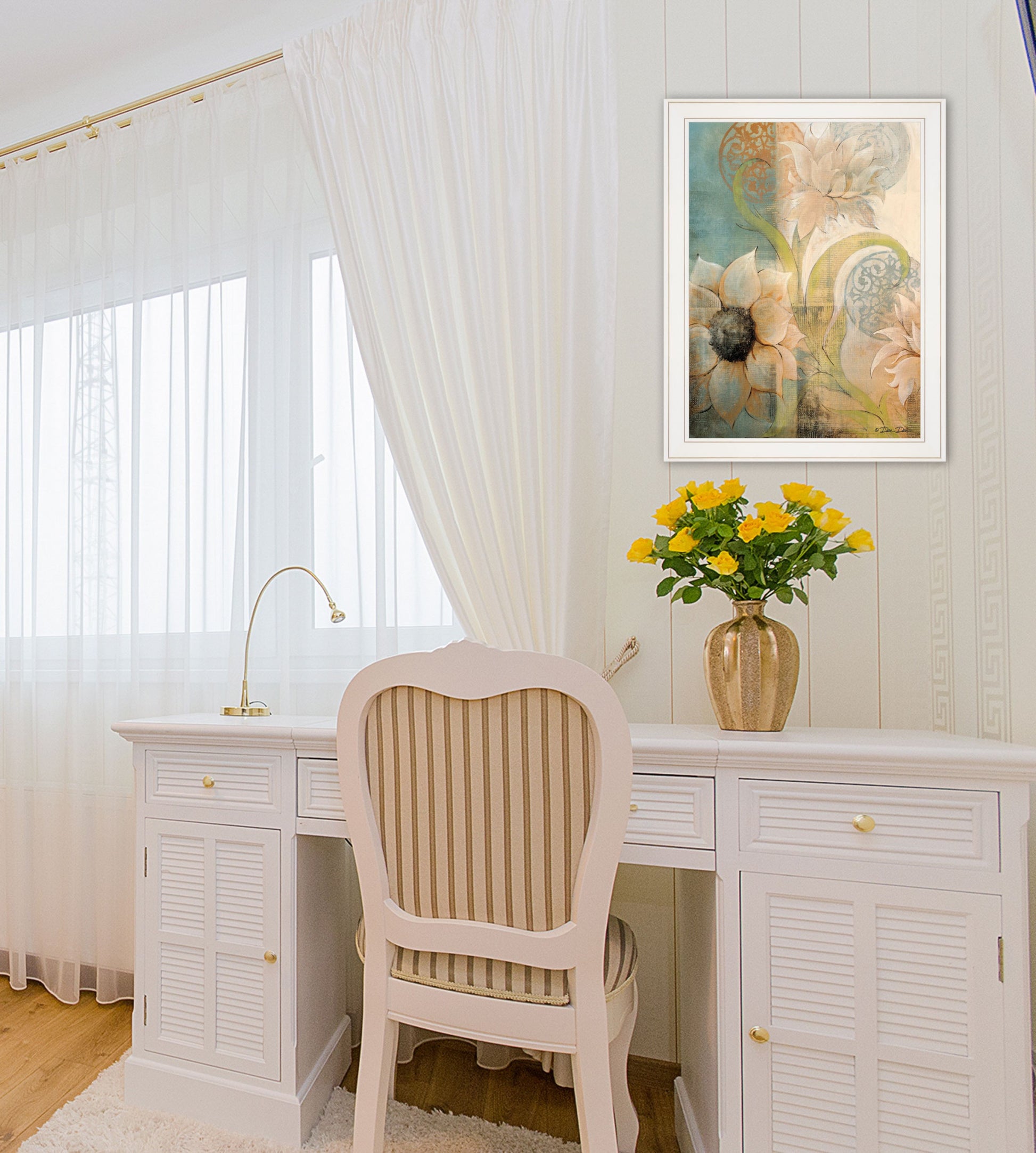 This meandering flowers I 1 white framed print wall art will add a beautiful decorative accent to your decor. This print is a visual artistic expression that allows you to decorate your space in style. Reproduced for you on paper, this hanging decorative accent will be a trendy and fashionable way to dress your walls. Hang on your wall to add some up to date fashion and decoration. Instantly liven up your space with this art that brings color and dimension to your walls. 27 inches H x 21 inches W x 1 inches D
