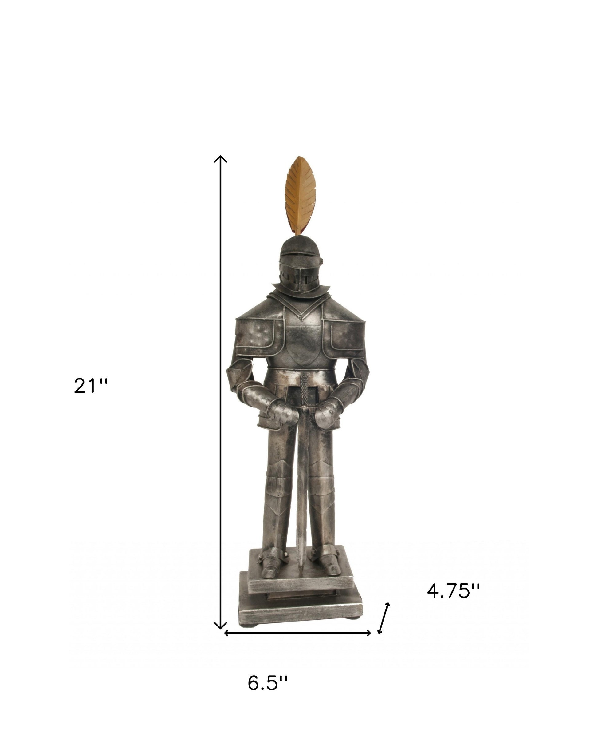 The suit of armor came into use at the beginning of the 15th Century. It usually consists of the helm, breastplate, and backplate, gauntlets, pauldrons, vambraces, counters, sabatons, greaves and gorget, sometimes called a neck guard. The suit of armor was usually afforded only by the nobility or professional soldiers as its cost could equal that of a small farm. Our suit of armor is 100% handmade from tin and comes with intricate details. Features: - 100% handmade from tin - Metal Sword is included - Double metal leaves yellow and red behind the head - Come with the base - Antique paint Its a great item for office decoration or medieval warfare enthusiasts.