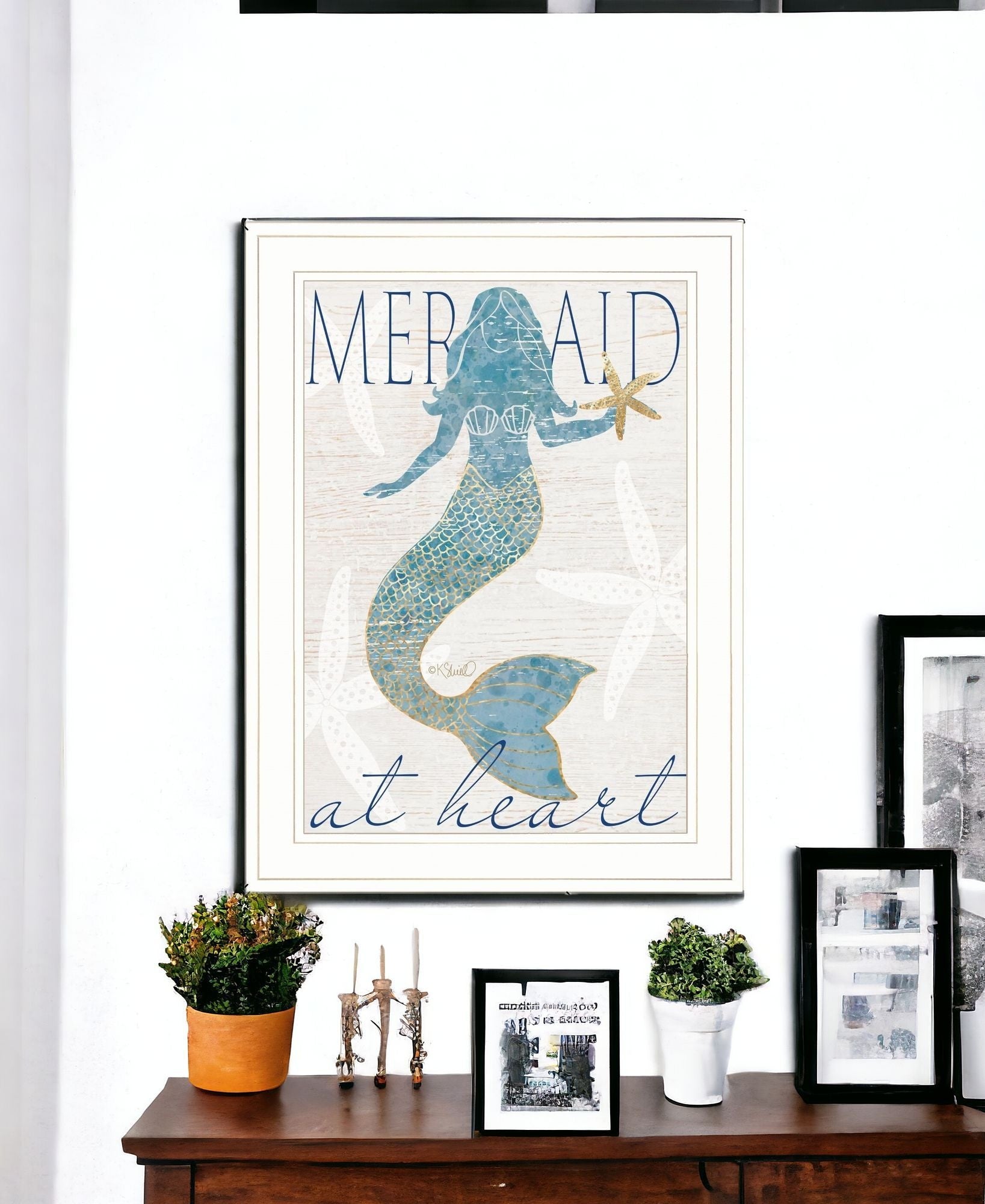 Unique and decorative, this mermaid at heart 1 white framed print wall art will leave a lasting impression. This print is a visual artistic expression that allows you to decorate your space in style. Reproduced for you on wood, this hanging decorative accent will be a trendy and fashionable way to dress your walls in a rustic and modern farmhouse vibe. Hang on your wall to add some up to date fashion and decoration. Utilize this opportunity to create a focal point in the room with this fabulous wall decor option. 19 inches H x 15 inches W x 1 inches D