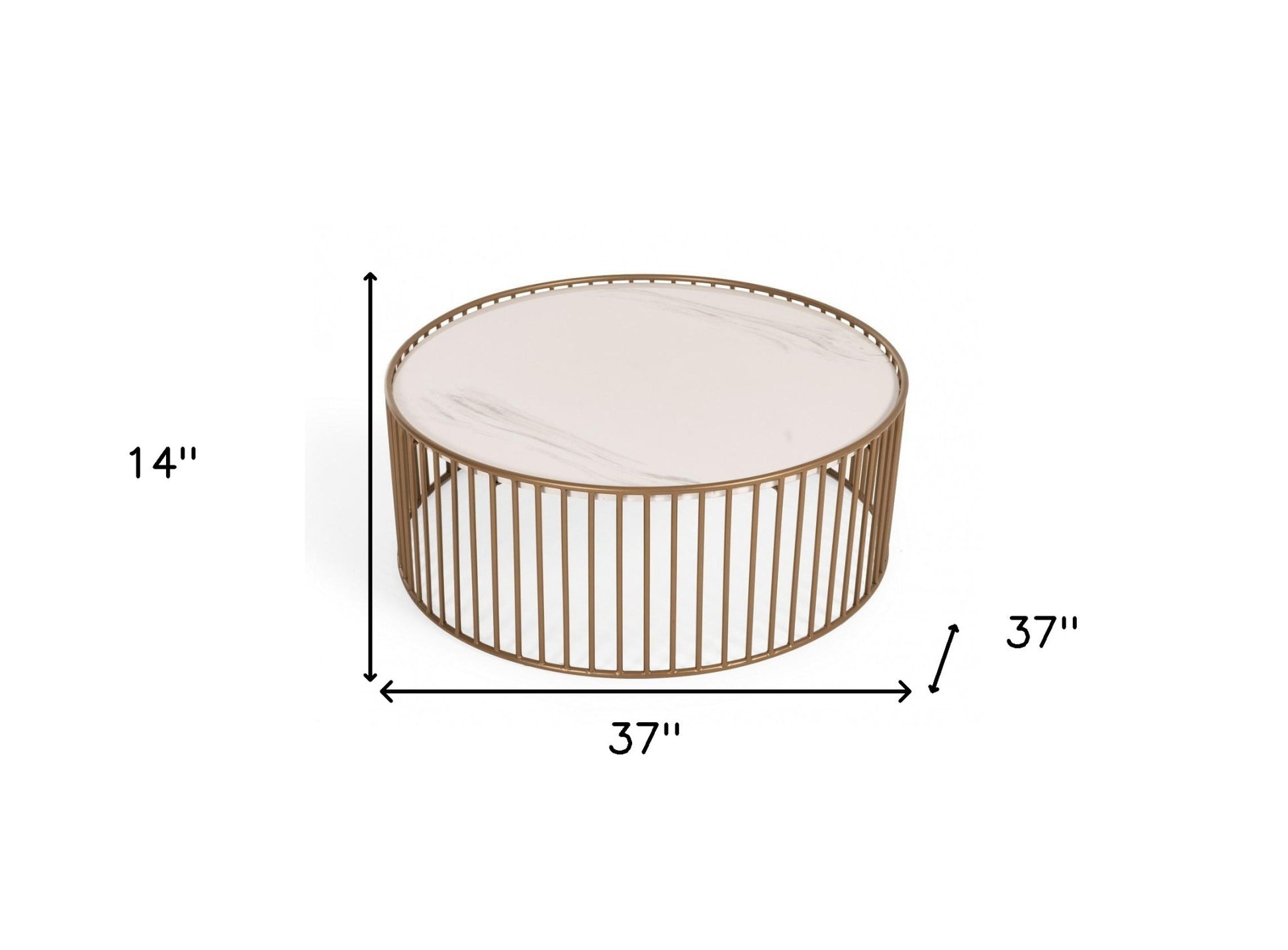 A vision set in stone, the Modern Round White and Gold Faux Marble Coffee Table uses geometric shapes, to achieve an open and airy feel. Not your typical coffee table, the thick faux marble circular table top contrasts beautifully with the linear base framework, constructed from gold powder-coated tubular metal. Highlighting a unique appearance, the sturdy and captivating table adds a modern flair and can spruce up the mundane atmosphere in any space. 14" x 37" x 37"