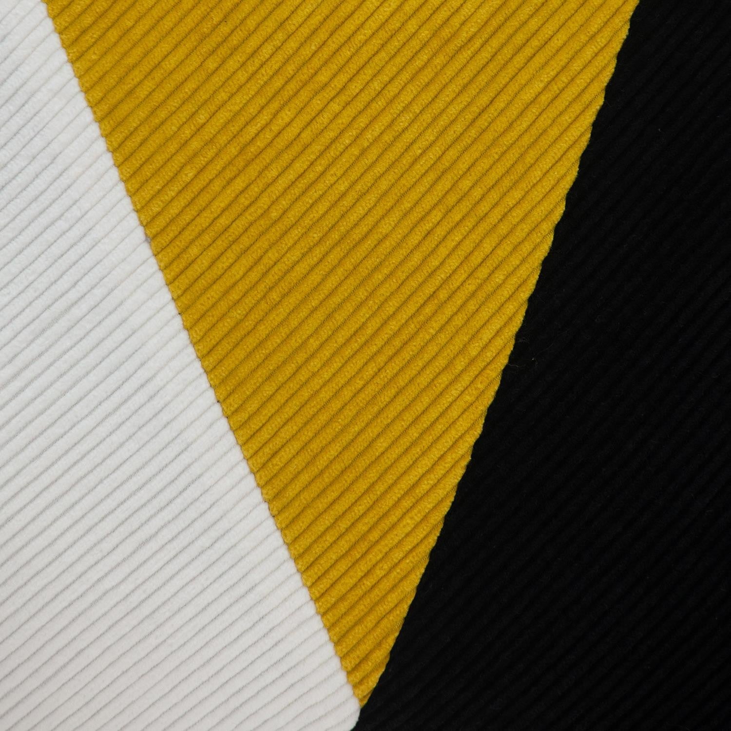 Strike a charm in your home with the Multicolor Yellow Highlight Soft Touch Throw Pillow. Uniquely designed with corduroy styled lines, this all cotton multicolored pillow shines throughout your home. The three tone geometric hue design makes a bold statement with it's center yellow triangle highlight. Meticulously crafted to perfection the throw pillow adds a splash of color to your existing material lifestyle. Cozy and captivating this throw pillow makes for an excellent decorative element with it's solid backside that also includes a flap concealing a zipper for easy insertion/removal. Add this throw pillow to your bed, sofa or armchair for a splash of color! 20" x 20" x 4"