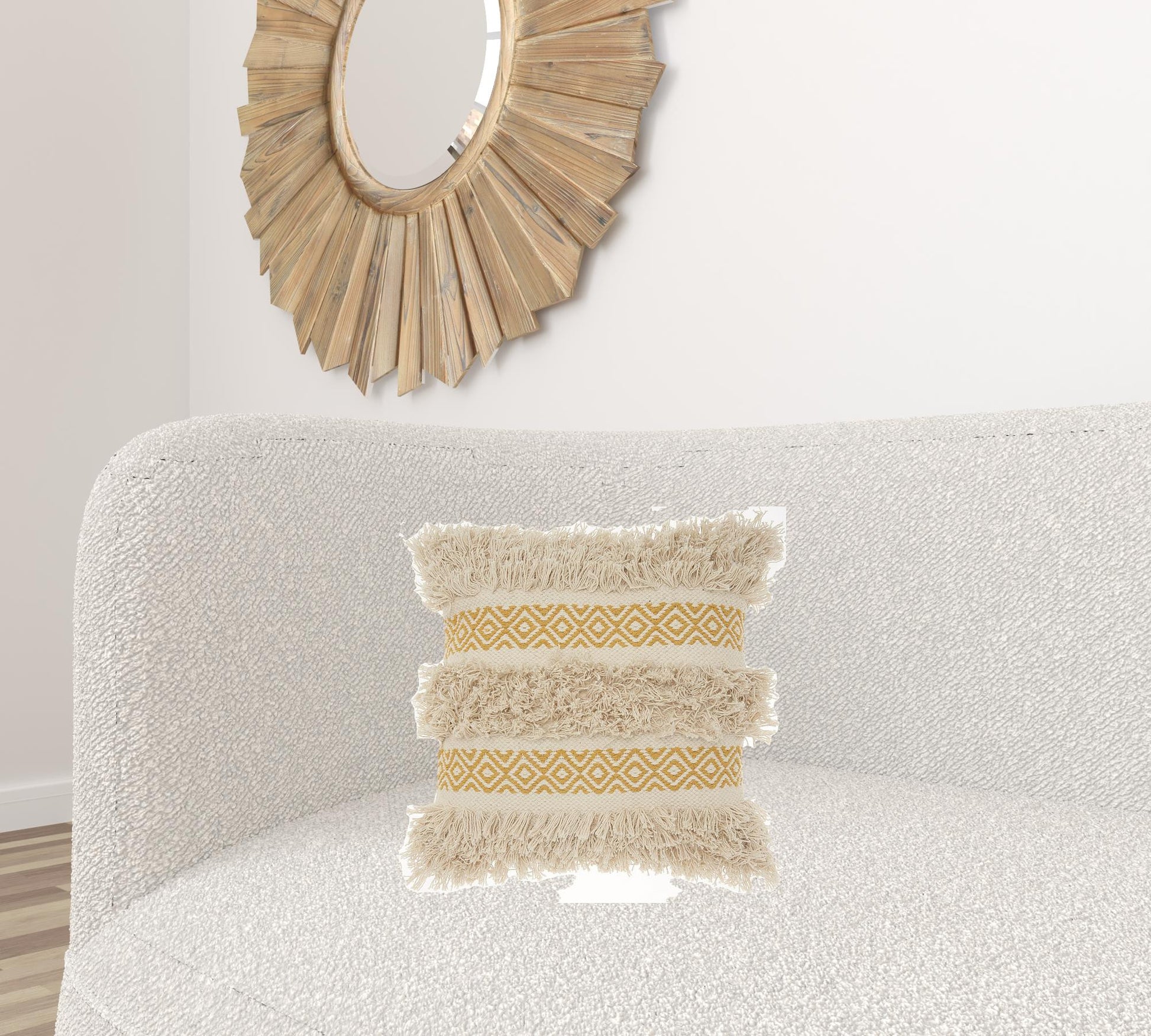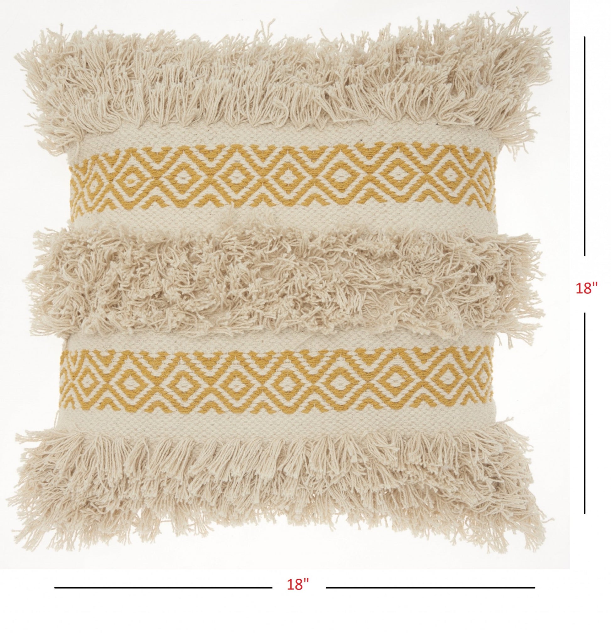 This Mustard Diamond Patterned Throw Pillow is the physical embodiment of fun, funk, and fluff. The ingenious design does well in shining a warm light of comfort and coziness to any space it is taken to. The super-soft fringes and striped diamond pattern layer give the best of both worlds being comfortable and engaging. The look is made to be long-lasting due to the implementation of 100% cotton fabric throughout the body of the pillow. Express your creativity and bohemian styling in the most elaborate and fun way with this simple add-on that is bound to make your space feel warm and happy. 18” x 18” x 5”