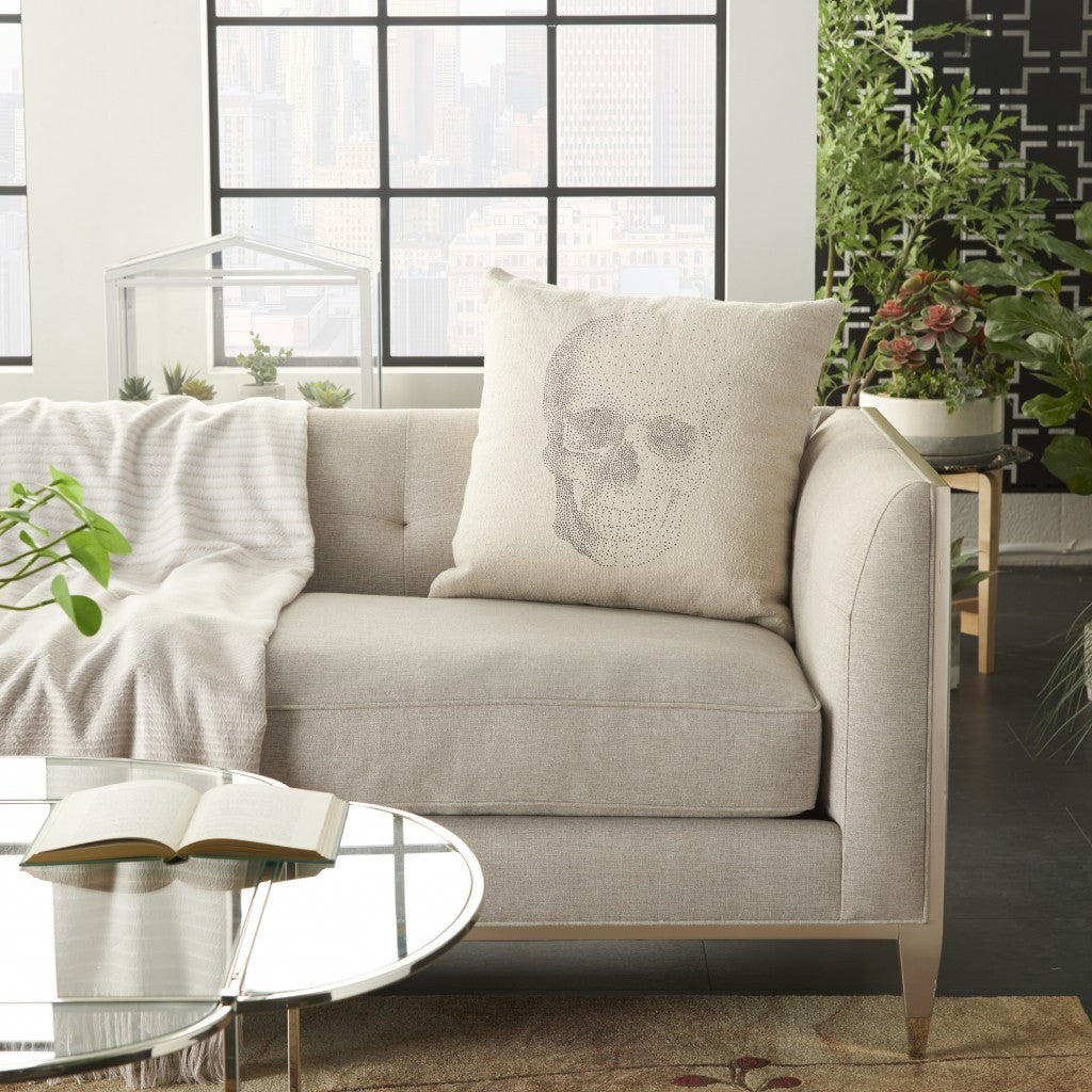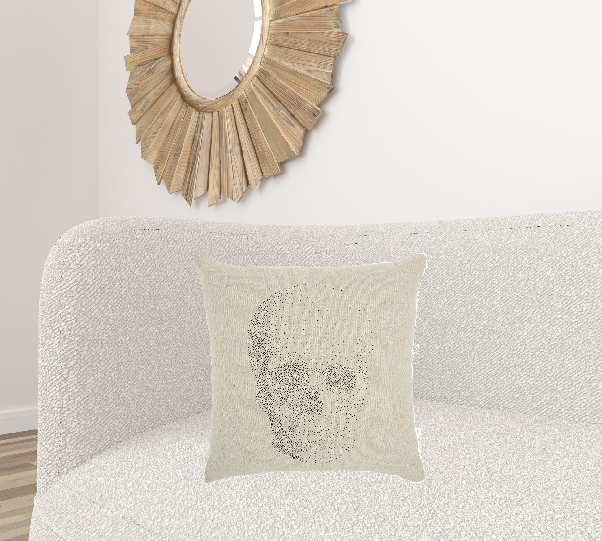 Express your unique taste in a subtle yet strong way with this rare Natural Beige Faded Skull Throw Pillow. The detailed skeleton graphic is presented with a soft touch fade to give an intriguing and alluring finish. To help the dominant beige color stay clean and immaculate for days on end, 100% cotton material is used throughout the piece. The natural beige color is best suited around dark colors and abstract decorations. The combination will bring in the focus of guests inside your creative living space in the most curious and welcoming way. This distinctive and funky design will be a great accent for your modern space. 20” x 20” x 5"