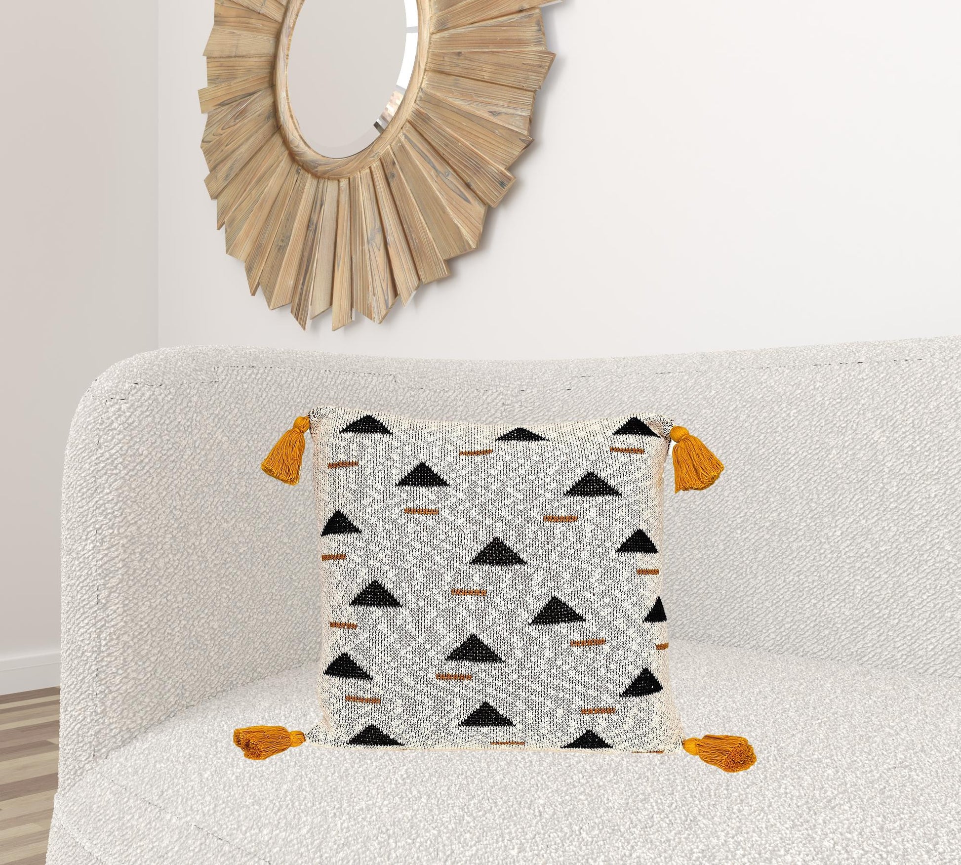 The Natural Knitted Throw Pillow delivers a sense of calmness, comfort, and simplicity wherever it is placed. This 100% cotton knitted pillow has simple geometric patterns in colors black and mustard against the light natural color, accompanied by mustard-colored tassels on all four corners. It comes with a zipper closure on the edge and requires dry cleaning or spot cleaning. 20” x 20” x 4”