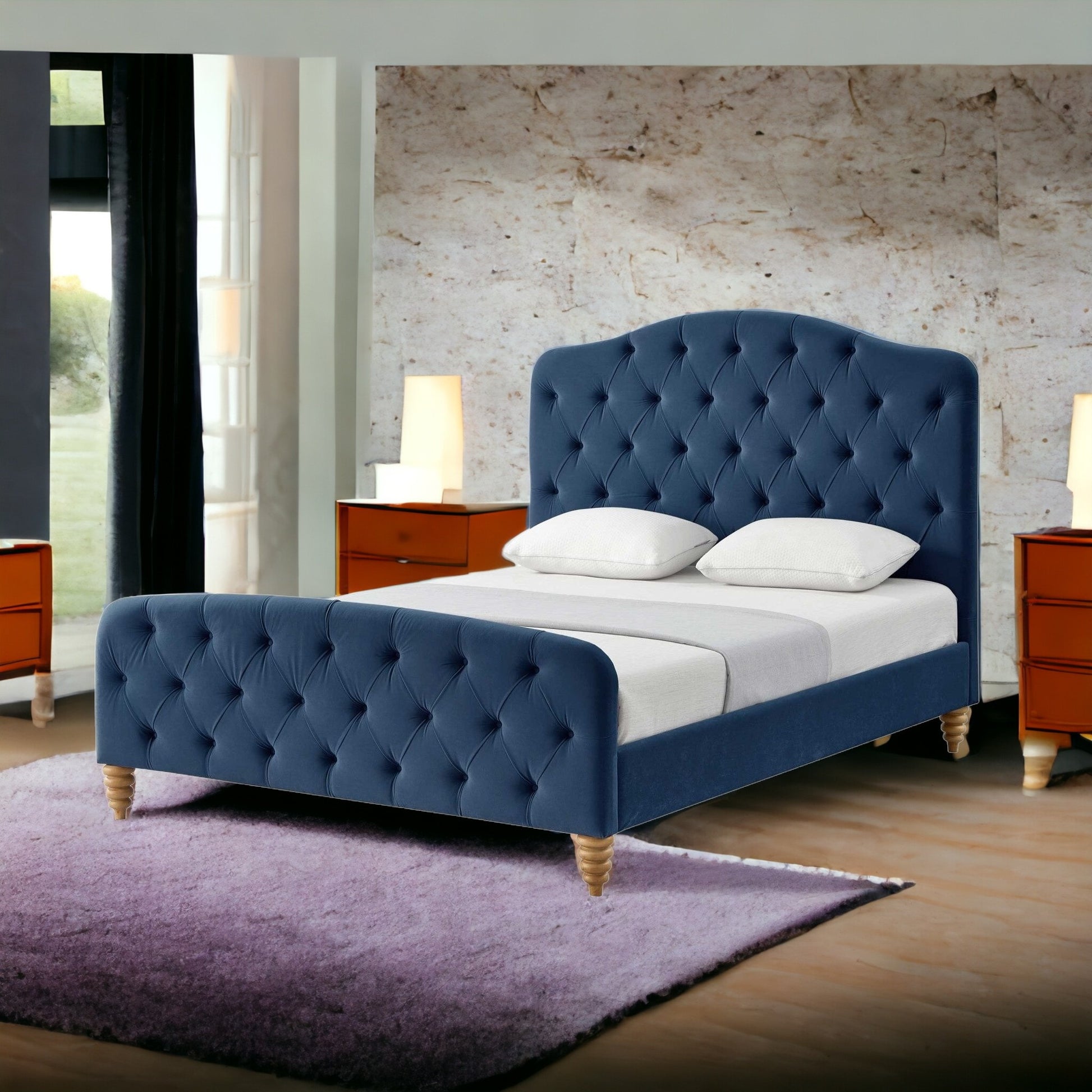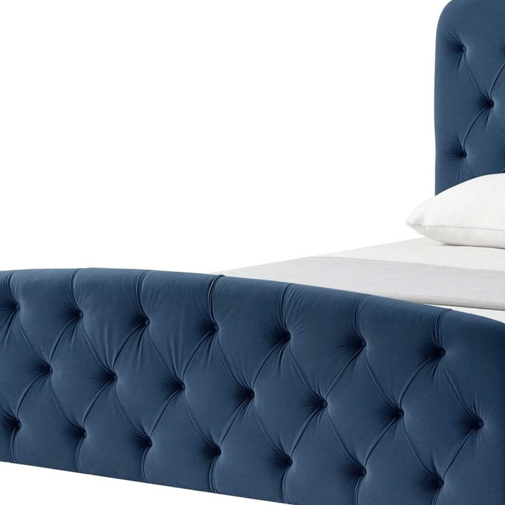 Drift off to a great night's sleep with the luxuriously stylish navy blue solid wood twin tufted upholstered velvet bed. Fully upholstered in a navy blue button tufted velvet, this bed brings a unique and designer perspective to your space. We spend so much time in our bedrooms, thus making quality craftsmanship and good looks vitally important. This bed is the perfect way to make your bedroom comfortable and inviting. 54-inch H x 82.3-inch W x 42.7-inch D