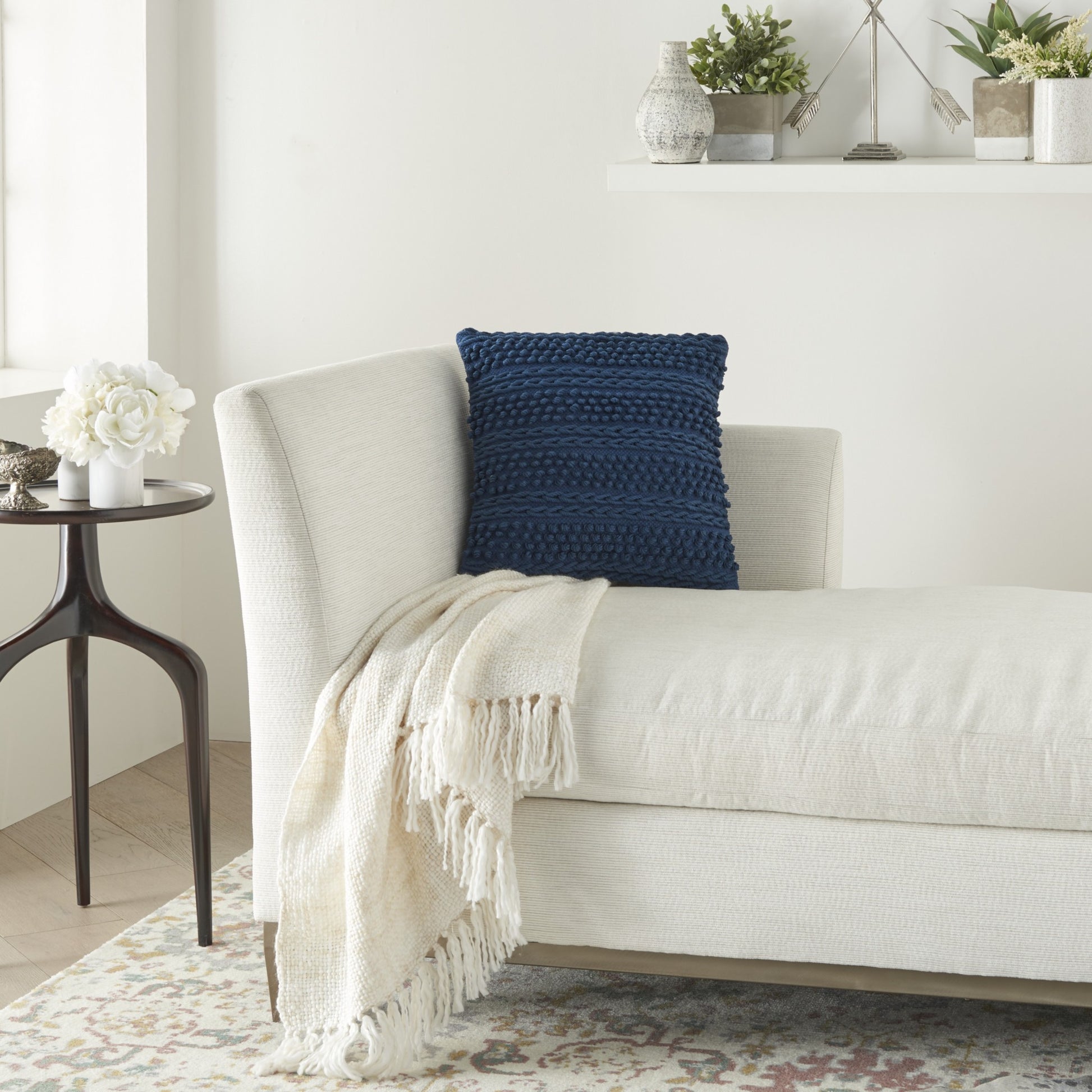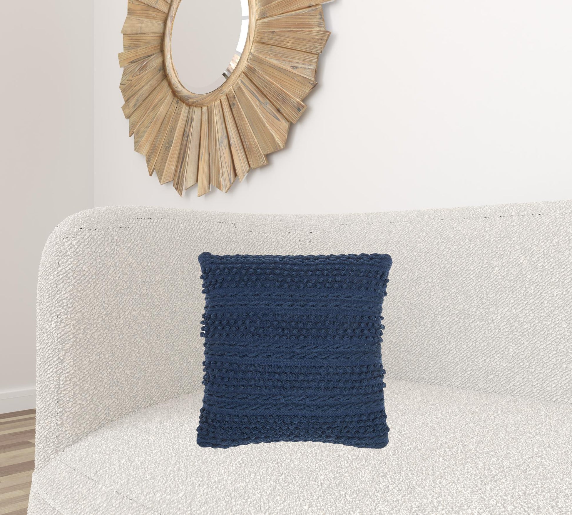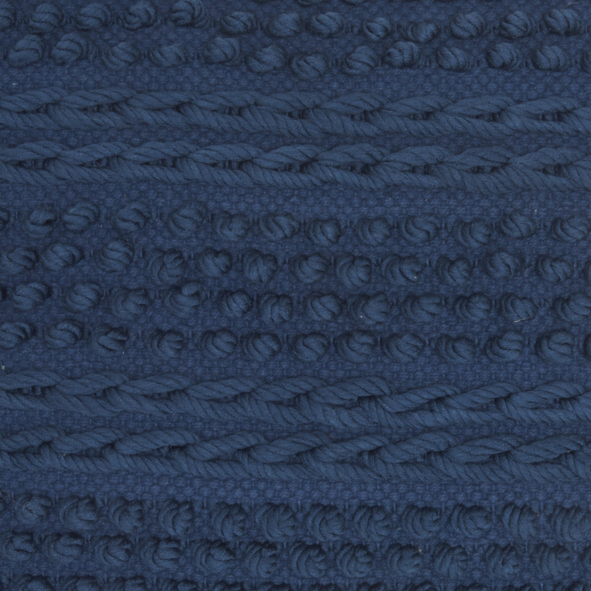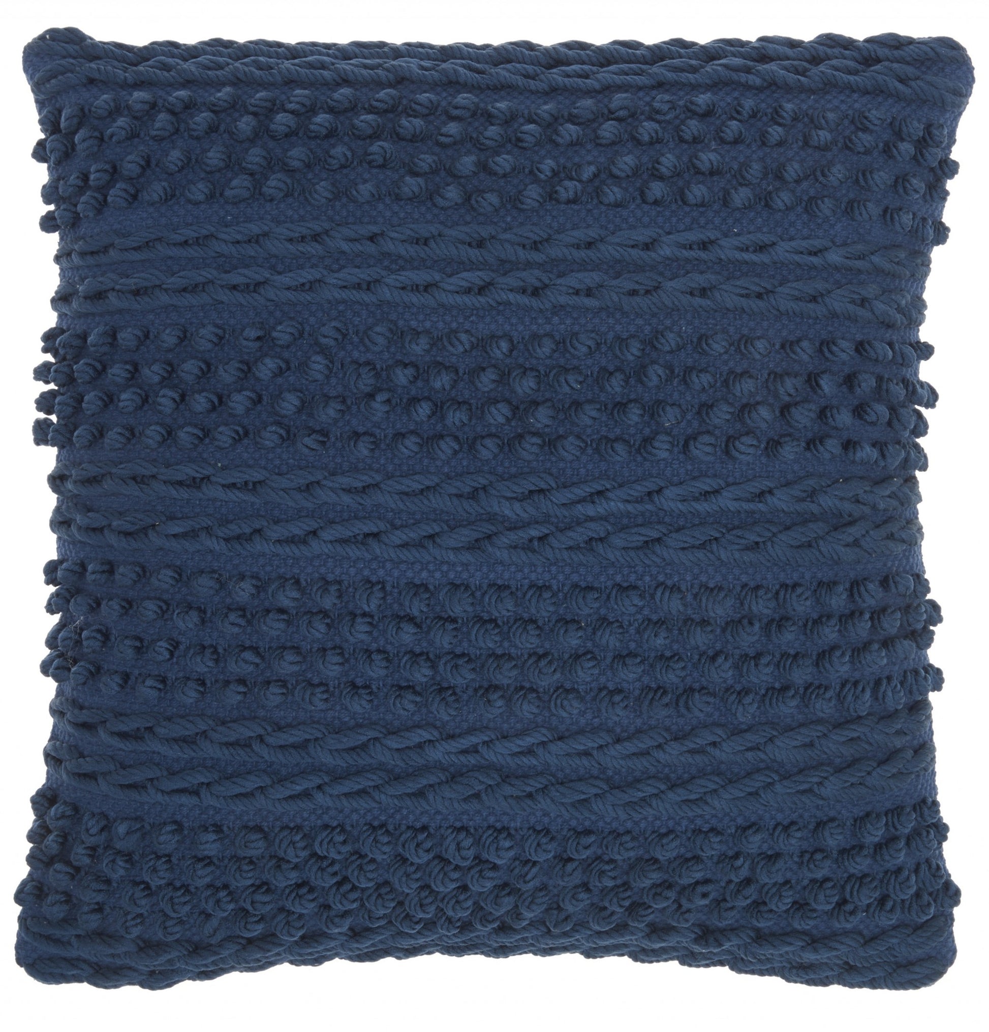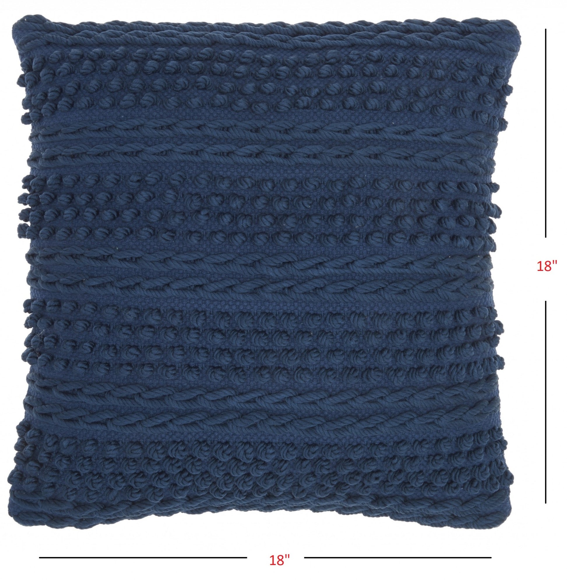 Set a calm and relaxing tone into your living space with this Navy Blue Textured Dots and Stripes Throw Pillow that is bound to upgrade the aesthetics of any casual or contemporary setting. Featuring a single hued color palette, this pillow is designed in a classic textural pattern with braided stripes and raised pom-pom to create a fun yet luxurious appeal to the entire piece. Carefully crafted with 60% cotton and 40% polyester, this decorative pillow is not only durable and easy to clean but also feels super soft on the touch. This classy and cozy throw pillow will serve as a great ornate accent for your bed, sofa, or chair while harmonizing with the modern decors of your interior. 18” x 18” x 5”