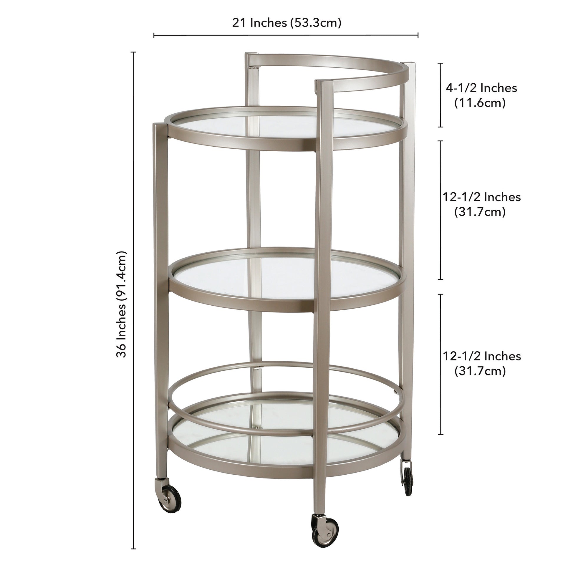 Add a touch of modern elegance to your home with our nickel steel and glass round rolling bar cart. This sleek bar cart features a steel frame and a glass top, creating a sophisticated look that will complement any decor. The round shape adds a unique twist to the design, while the included wheels make it easy to move from room to room. With its stylish nickel color, this bar cart is not only functional but also a stylish statement piece. Whether you're entertaining guests or simply enjoying a drink on your own, this bar cart is sure to enhance your home bar experience. 36-inch H x 21-inch W x 21-inch D