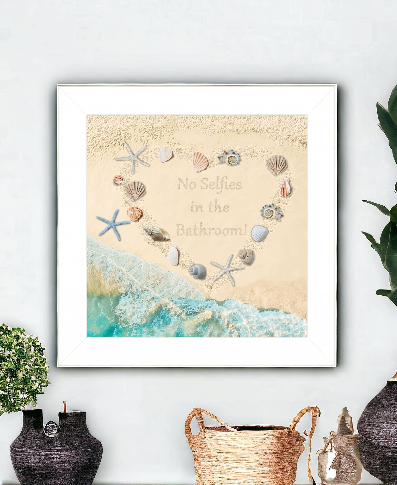 This no selfies in the bathroom sea 1 white framed print wall art will add a beautiful decorative accent to your decor. This print is a visual artistic expression that allows you to decorate your space in style. Reproduced for you on wood, this hanging decorative accent will be a trendy and fashionable way to dress your walls in a rustic and modern farmhouse vibe. Hang on your wall to add some up to date fashion and decoration. Instantly liven up your space with this art that brings color and dimension to your walls. 15 inches H x 15 inches W x 1 inches D