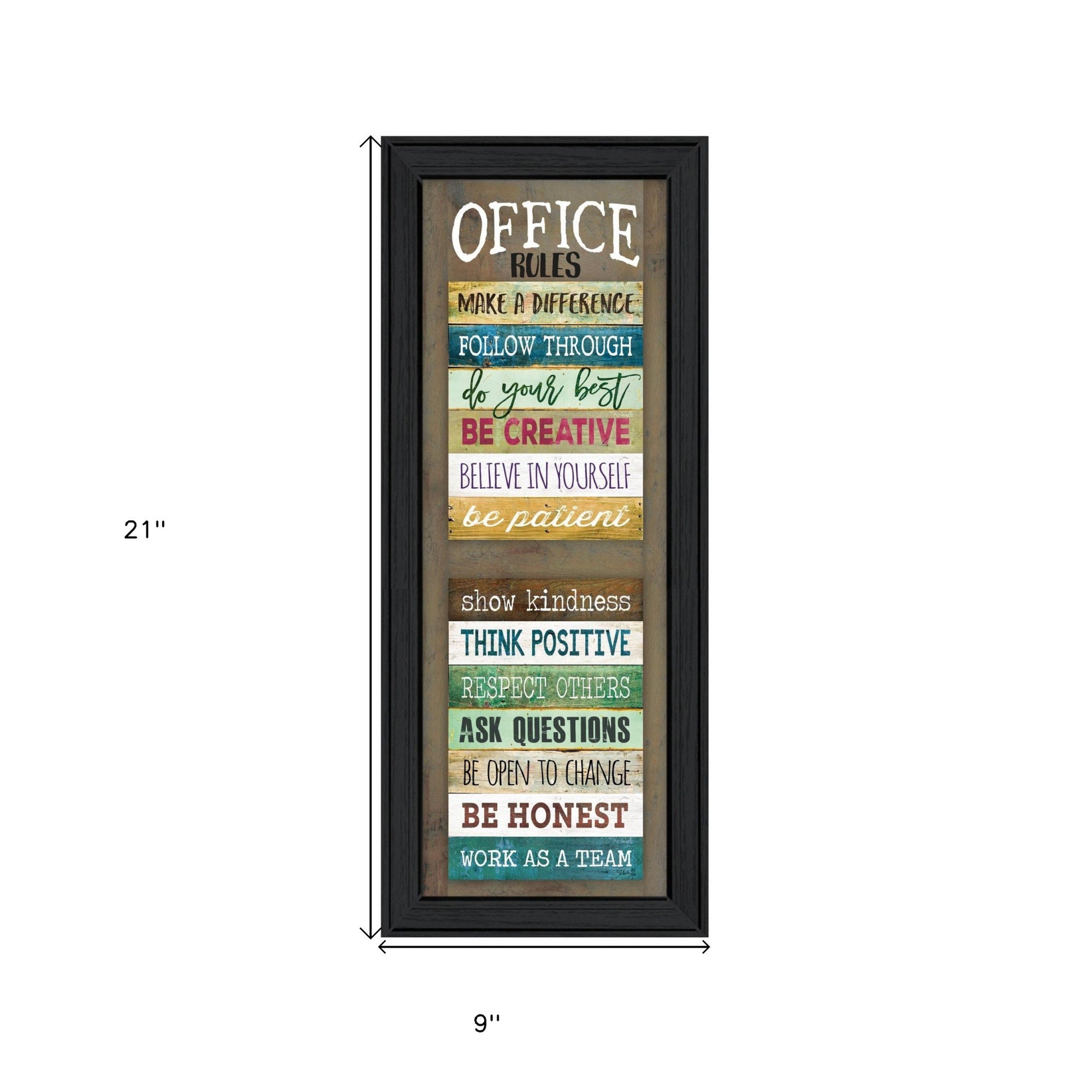 Add an air of fashion to your room and rejuvenate the space with this office rules 2 black framed print wall art. This print is a visual artistic expression that allows you to decorate your space in style. Reproduced for you on paper, this hanging decorative accent will be a trendy and fashionable way to dress your walls. Hang on your wall to add some up to date fashion and decoration. Instantly liven up your space with this art that brings color and dimension to your walls. 21 inches H x 9 inches W x 1 inches D
