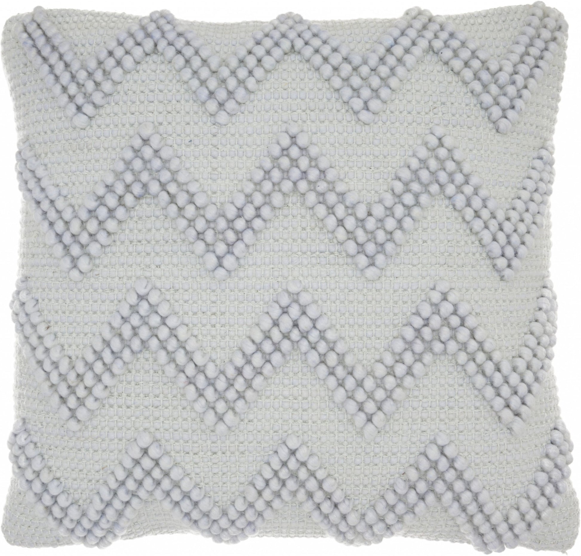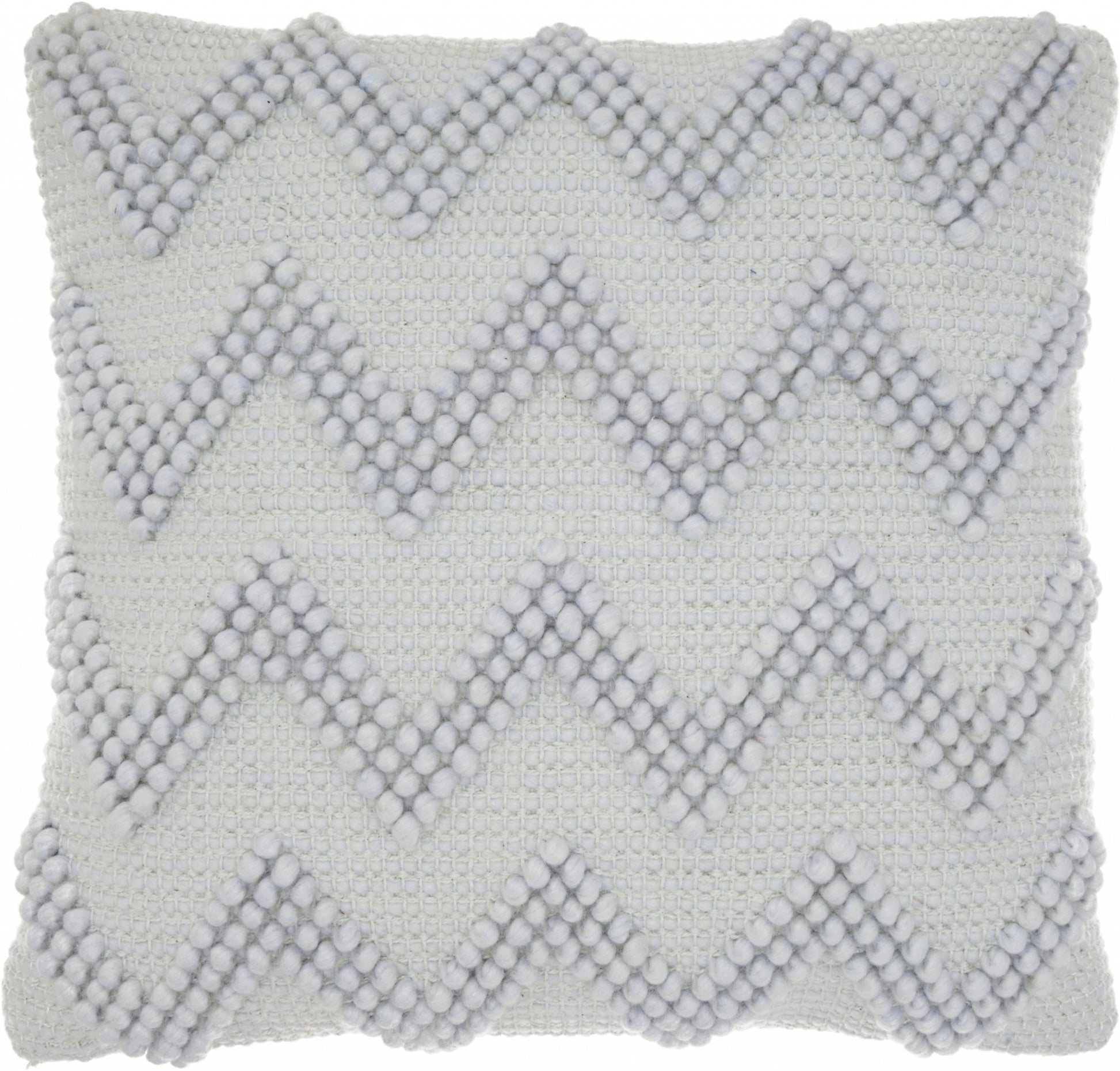 With this Pale Blue Chevron Detail Throw Pillow you can add the perfect finishing touch to your bed or your couch with a great combination of style and comfort. This pillow has a square shape and is covered in a textured pale blue colored fabric. This fabric serves as the perfect background for the detailed chevron pattern that is all along the front of this throw pillow. The chevron pattern is made of pale blue colored thread that is tightly wound in small circles. There are three layers of small circles in each of the chevron stripes which gives more depth and dimension to the overall look. This throw pillow will look great anywhere in your home and elevate the look of all the seating spaces you have. 6" H x 20" W x 20" D