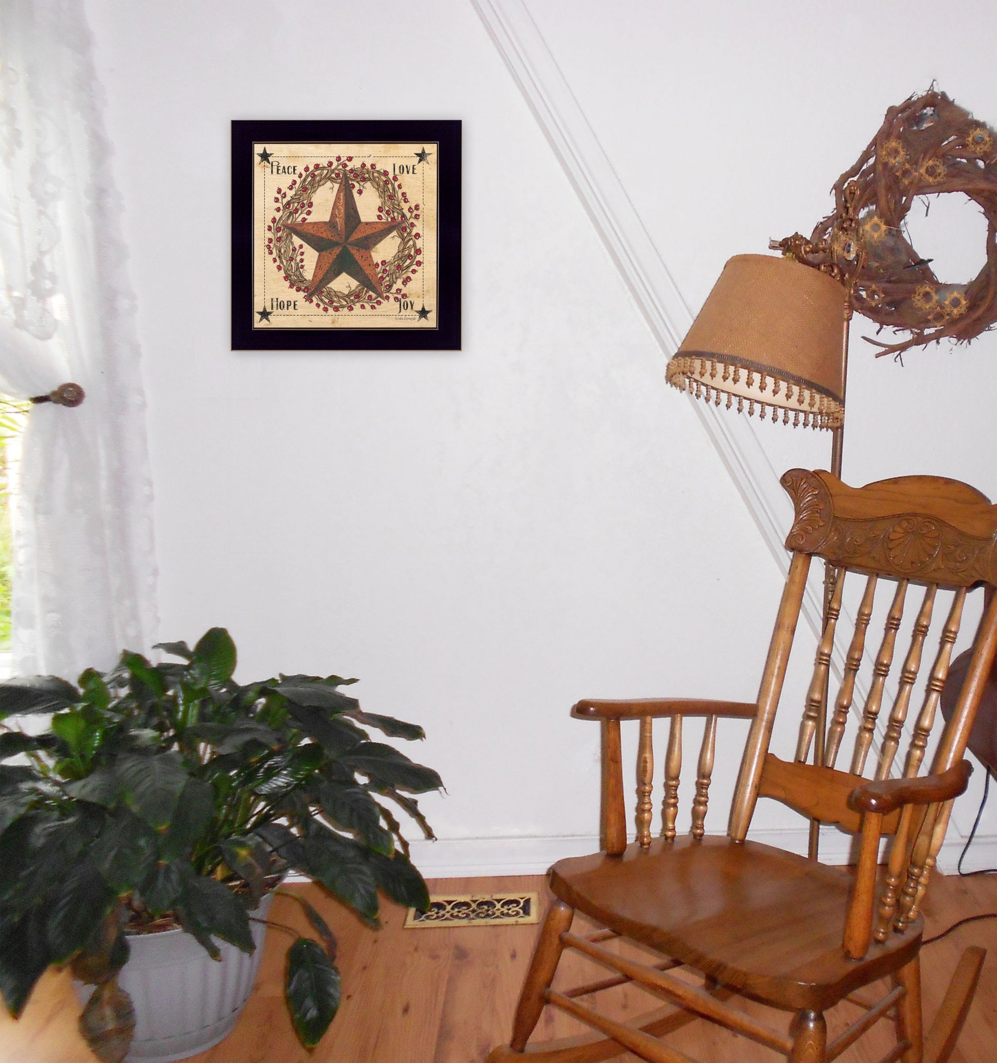 This peace love hope joy black framed print wall art is the perfect way to celebrate and decorate for the Christmas Season. This print is a visual artistic expression that allows you to decorate your space in style. Reproduced for you on paper, this hanging decorative accent will be a trendy and fashionable way to dress your walls. Adding this hanging wall art to your space to make your room feel more finished and attractive. Utilize this opportunity to create a focal point in the room with this fabulous wall decor option. 14 inches H x 14 inches W x 1 inches D