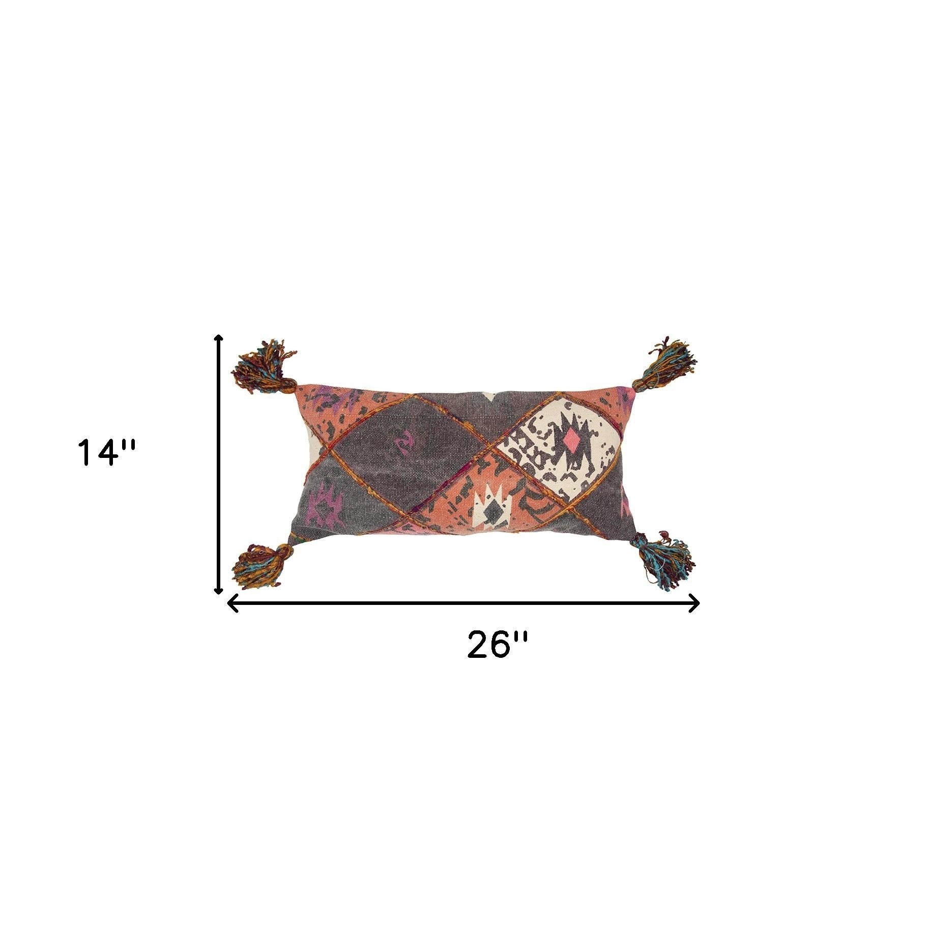 Peach Gray Tribal Corner Tasseled Lumbar Pillow