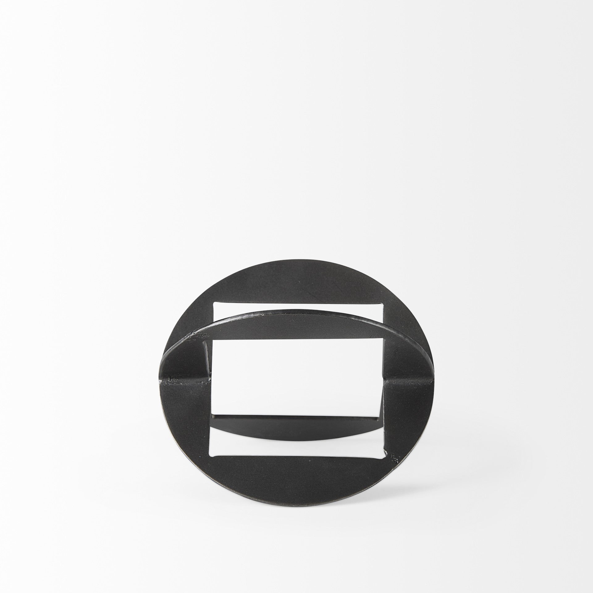 With this Petite Black Metal Geometric Decor Piece you can add just the right touch of unique modern design to the decor in your home. This decor piece is made from solid metal and features two small circle shapes that have square cut outs intersecting at two different points. This intersection creates an X-shaped decor piece that plays with different shapes but still keep its modern and minimal look intact. This decor piece has a matte black finish on it and can be used anywhere in your home no matter what interior style or colors you already have. You can also place this decor piece near a window or a light source and enjoy the slight and elegant shapes that are projected through it. 6" H x 6" W x 6" D