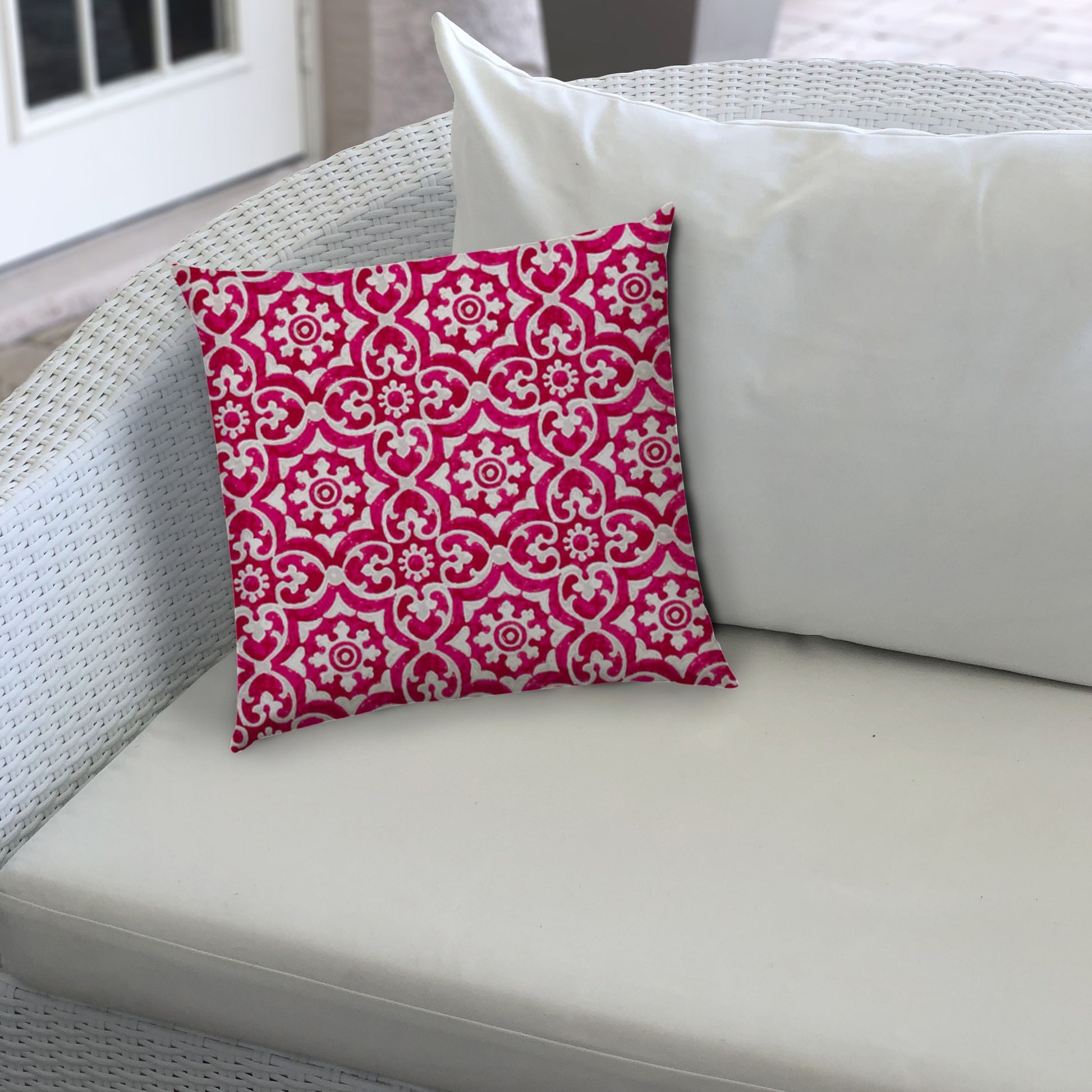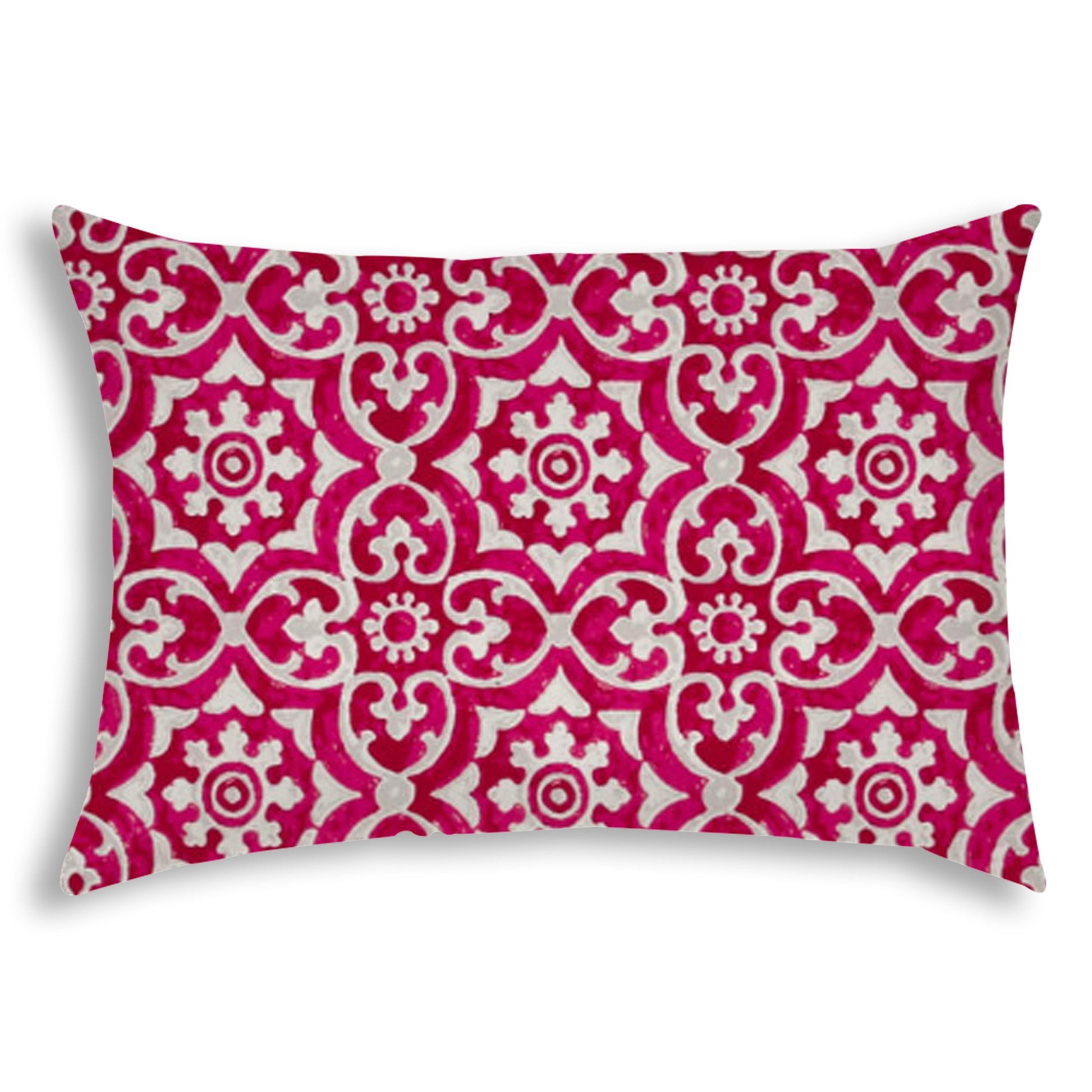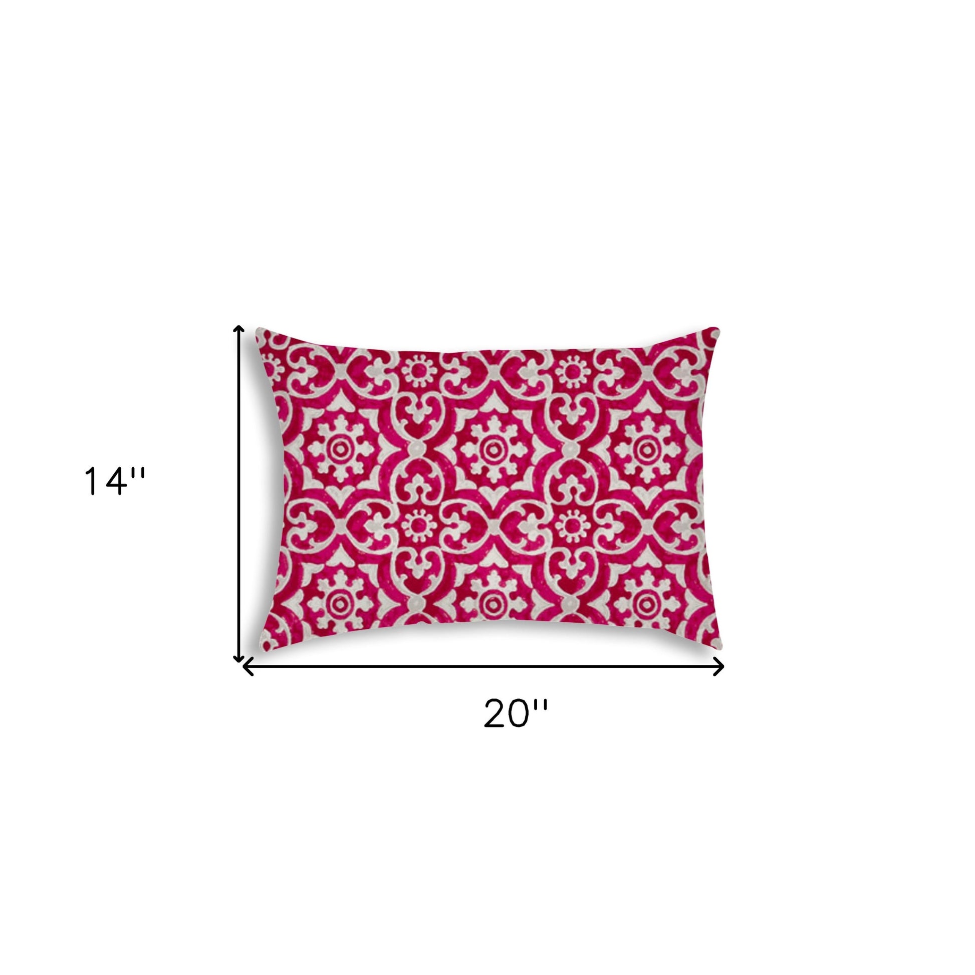 Add a pop of color to your traditional décor with this Pink Medallion Indoor Outdoor Sewn Lumbar Pillow. A shimmering hot-pink color envelops the base of the pillow with gray and white medallions printed throughout to give it a vintage glamour. Constructed with a high-quality polyester fabric, the pillow is soft yet durable to last for years. The pillow can withstand sun exposure for up to 500 hours without fading and are water resistant to prevent mildew making it ideal for both indoor and outdoor settings. The pillow is sewn closed with a soft polyfill insert for a comfortable experience. Pair this stunning boho inspired lumbar pillow with the antique pieces in your traditional abode to add a vintage charm. 14” x 20” x 5”