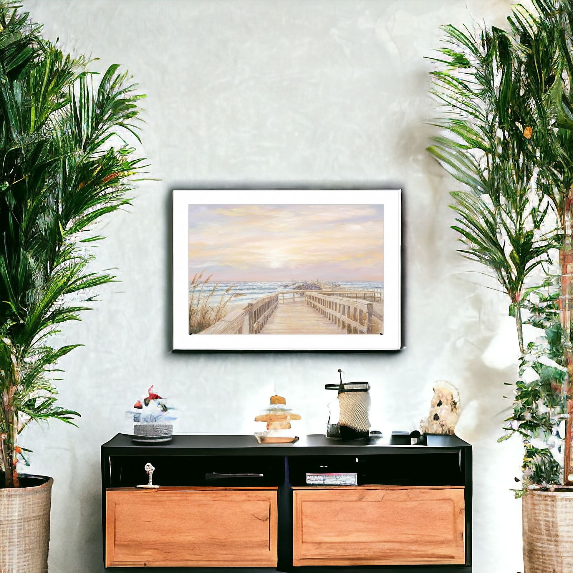 Unique and decorative, this ponce inlet jetty sunrise 1 white framed print wall art will leave a lasting impression. This print is a visual artistic expression that allows you to decorate your space in style. Reproduced for you on paper, this hanging decorative accent will be a trendy and fashionable way to dress your walls. Hang on your wall to add some up to date fashion and decoration. Utilize this opportunity to create a focal point in the room with this fabulous wall decor option. 14 inches H x 20 inches W x 1 inches D