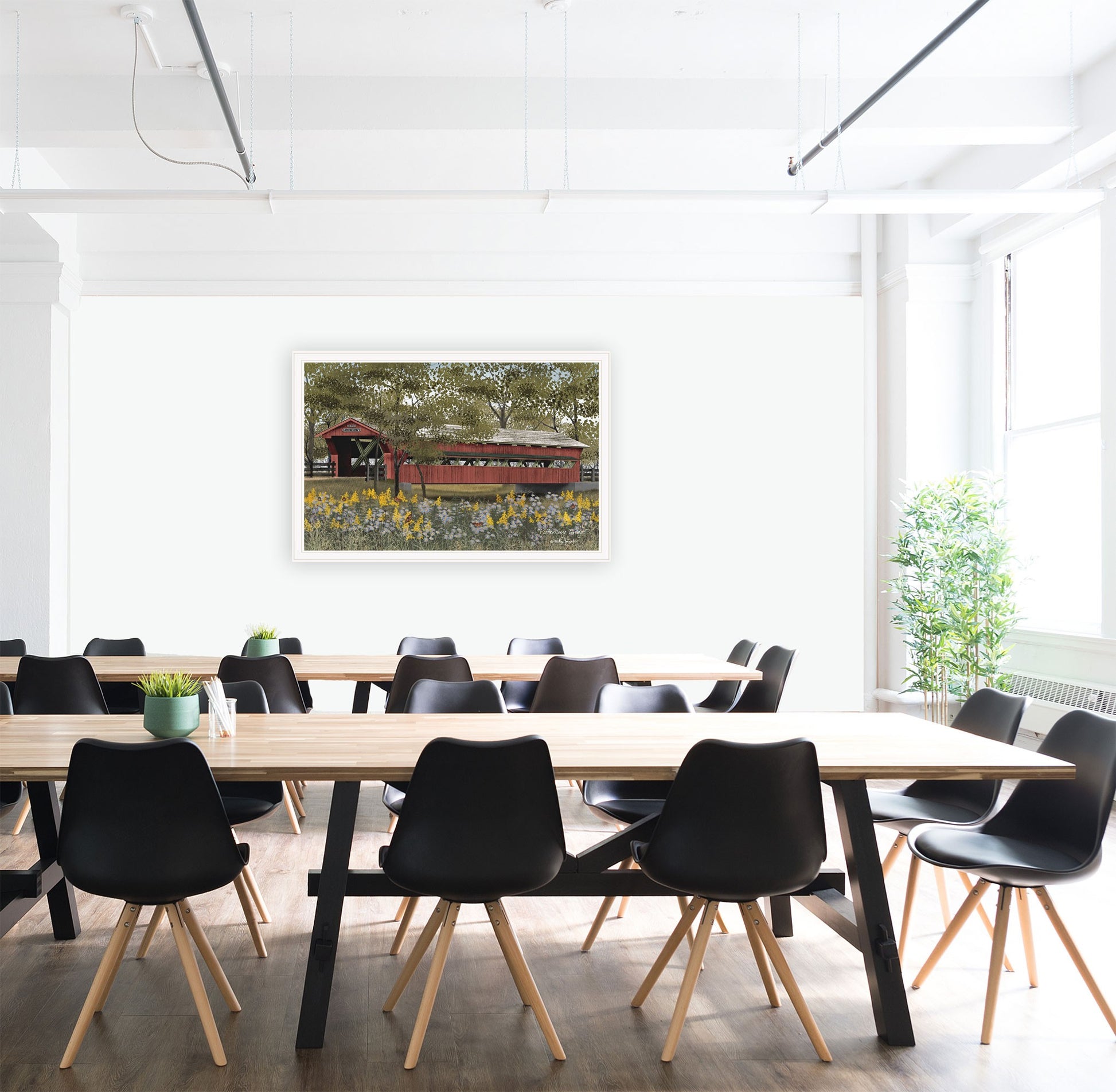 The pottersburg bridge 6 white framed print wall art is the perfect decorative accessory for your home. This print is a visual artistic expression that allows you to decorate your space in style. Reproduced for you on paper, this hanging decorative accent will be a trendy and fashionable way to dress your walls. Hang on your wall to add some up to date fashion and decoration. Instantly liven up your space with this art that brings color and dimension to your walls. 26 inches H x 38 inches W x 1 inches D