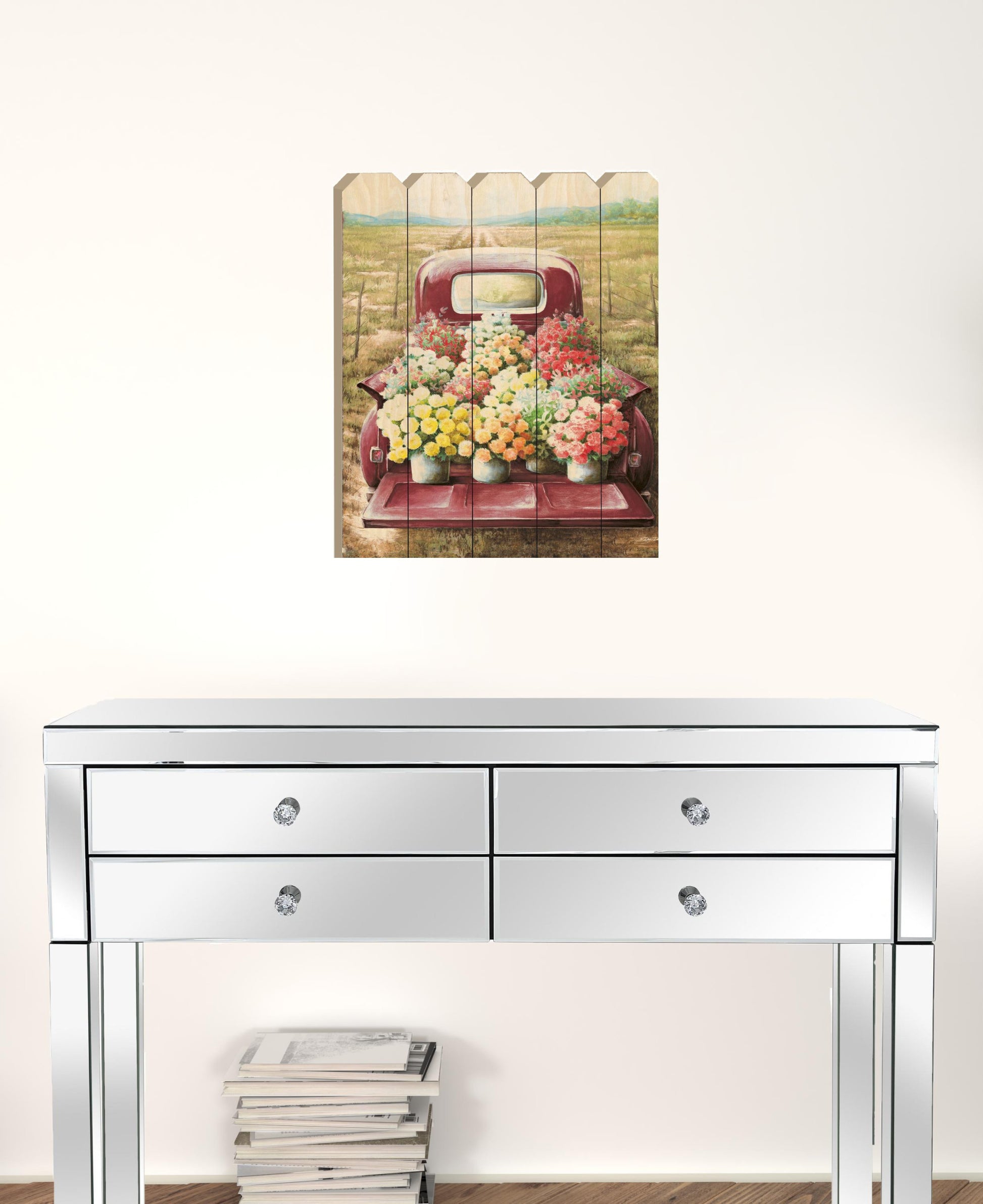 Unique and decorative, this pretty red truck flowers for sale unframed picket fence wall art will leave a lasting impression. This print is a visual artistic expression that allows you to decorate your space in style. Reproduced for you on wood, this hanging decorative accent will be a trendy and fashionable way to dress your walls in a rustic and modern farmhouse vibe. Adding this hanging wall art to your space to make your room feel more finished and attractive. Utilize this opportunity to create a focal point in the room with this fabulous wall decor option. 20 inches H x 15 inches W x 1 inches D