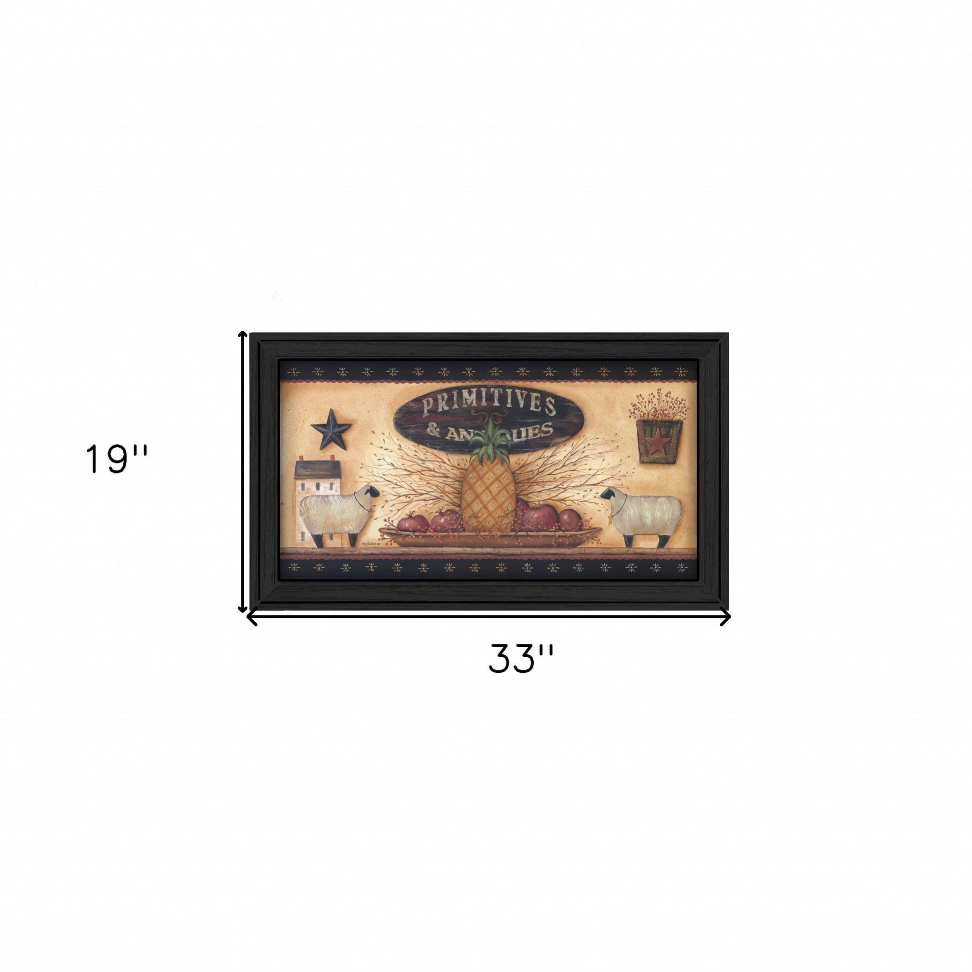 This primitive and antiques shelves black framed print wall art will add a beautiful decorative accent to your decor. This print is a visual artistic expression that allows you to decorate your space in style. Reproduced for you on paper, this hanging decorative accent will be a trendy and fashionable way to dress your walls. Adding this hanging wall art to your space to make your room feel more finished and attractive. Instantly liven up your space with this art that brings color and dimension to your walls. 19 inches H x 33 inches W x 1 inches D