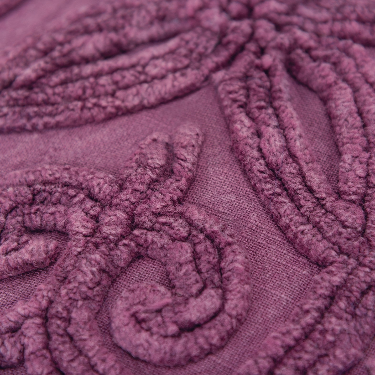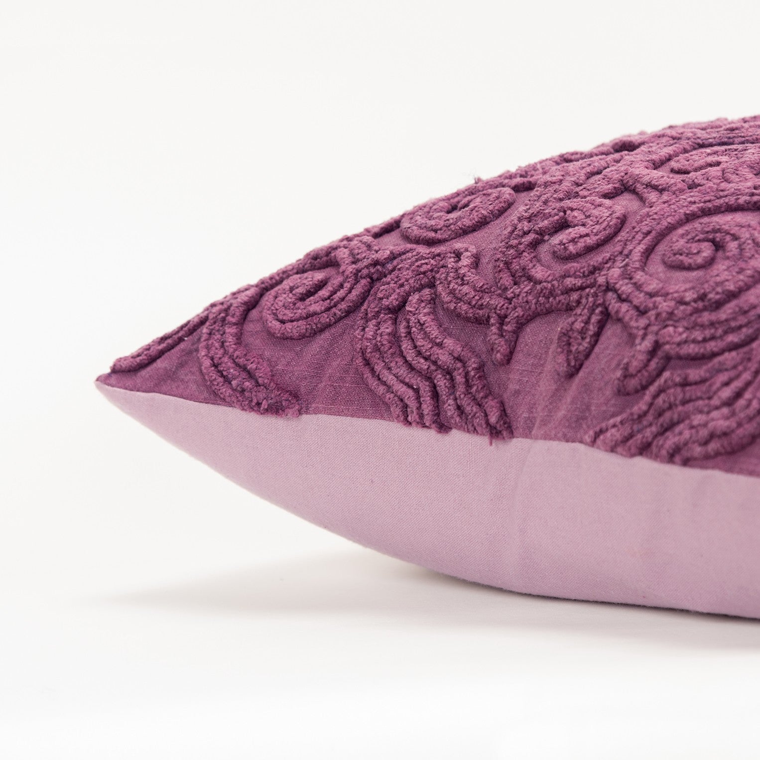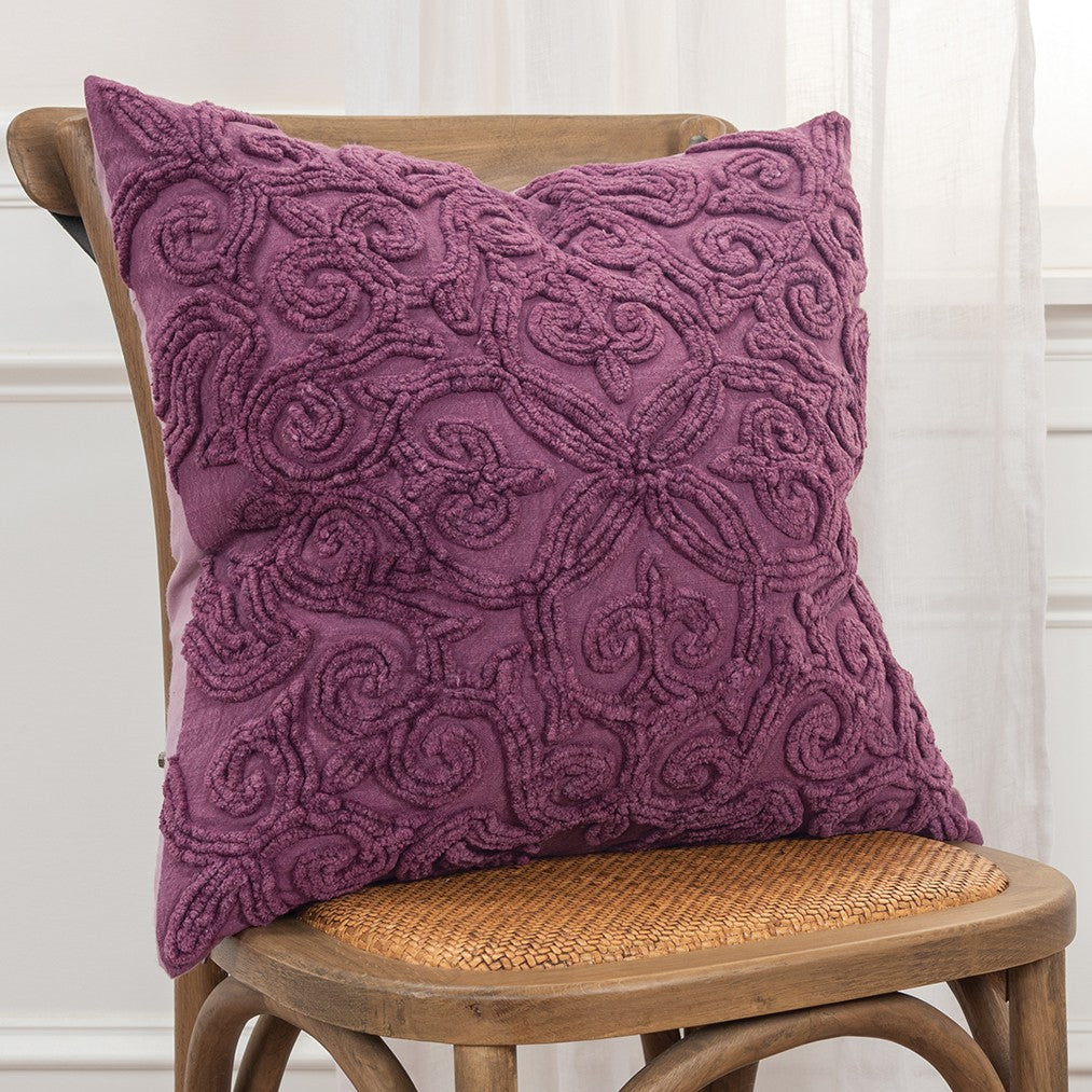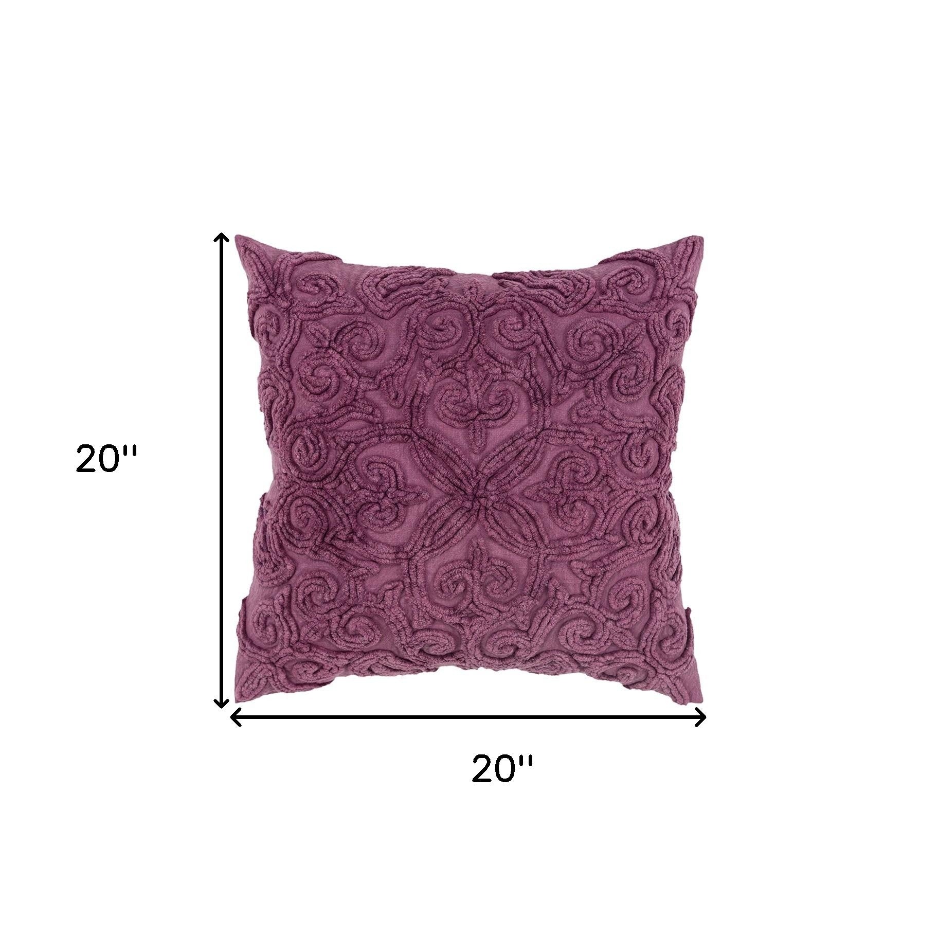 Showcase your sophisticated sense of style by layering this Purple Floral Patterned Heavy Textural Throw Pillow amidst your modern and contemporary décor. The pillow flaunts a Fleur de Lis pattern in heavy channel embroidery that was hand clipped and stitched onto the stone-washed base in purple, giving the pillow a luxurious vintage vibe. Constructed from a soft cotton canvas fabric that has extended durability for long-term use. The pillow comes with a solid matching cotton back with a hidden zipper closure for ease of cleaning and a polyfill insert that ensures a fluffy and cozy nature. The knife-edging on the pillow caters to the crisp and clean corners for a polished look that will perfectly complement any modern setting. Incorporate the rich textures and vibrant color of this decorative throw pillow in your living room to add a sense of traditional luxury and contemporary elegance to your home. 20” x 20” x 6.25”