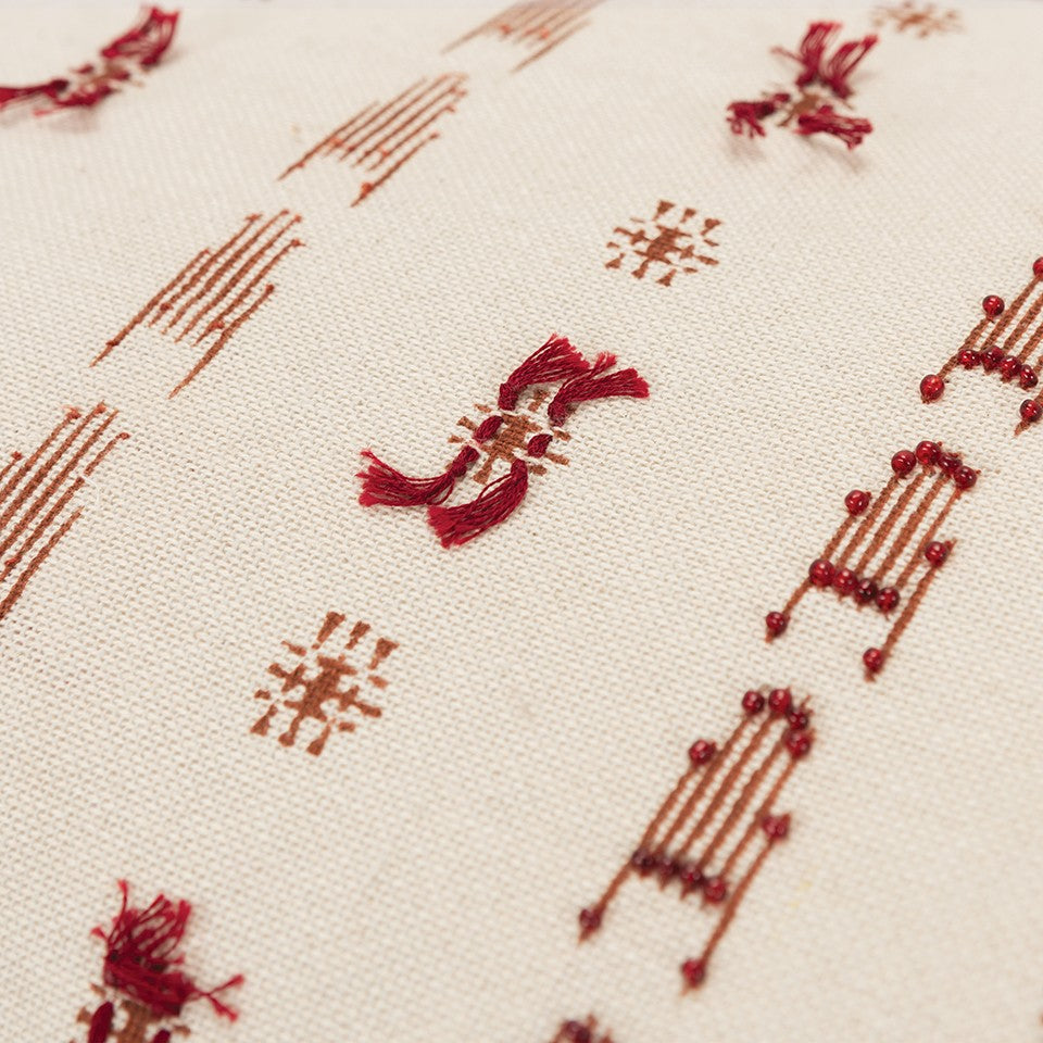 Embracing the modern aesthetic with a muted color palette, this Red Beige Tribal Inspired Tasseled Lumbar Pillow exudes a tribal essence with a bohemian flair. The hand-applied printed lines and Kantha stitch with knotted ends in red create a stunning contrast over the flecked beige-toned base while the four corner tassels serve as eye-catching embellishments on the pillow. Constructed with a soft cotton fabric for long-lasting durability and an inviting feel on the touch. The back of the pillow is a solid color with a hidden zipper closure for ease of cleaning. The pillow includes a polyfill insert that ensures a fluffy nature, while the knife edging gives it a polished and crisp look to work well with a variety of interior decors. Personalize the ambiance of your modern home with this decorative lumbar pillow that features rich textures and colors to add a tribal aesthetic to your room. 26" x 14” x 6.25”