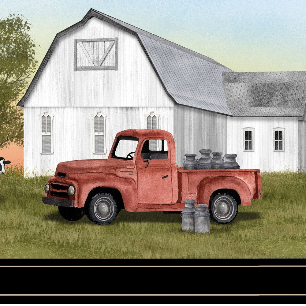 The red milk truck on the farm black framed print wall art is the perfect decorative accessory for your home. This print is a visual artistic expression that allows you to decorate your space in style. Reproduced for you on wood, this hanging decorative accent will be a trendy and fashionable way to dress your walls in a rustic and modern farmhouse vibe. Hang on your wall to add some up to date fashion and decoration. Instantly liven up your space with this art that brings color and dimension to your walls. 15 inches H x 19 inches W x 1 inches D