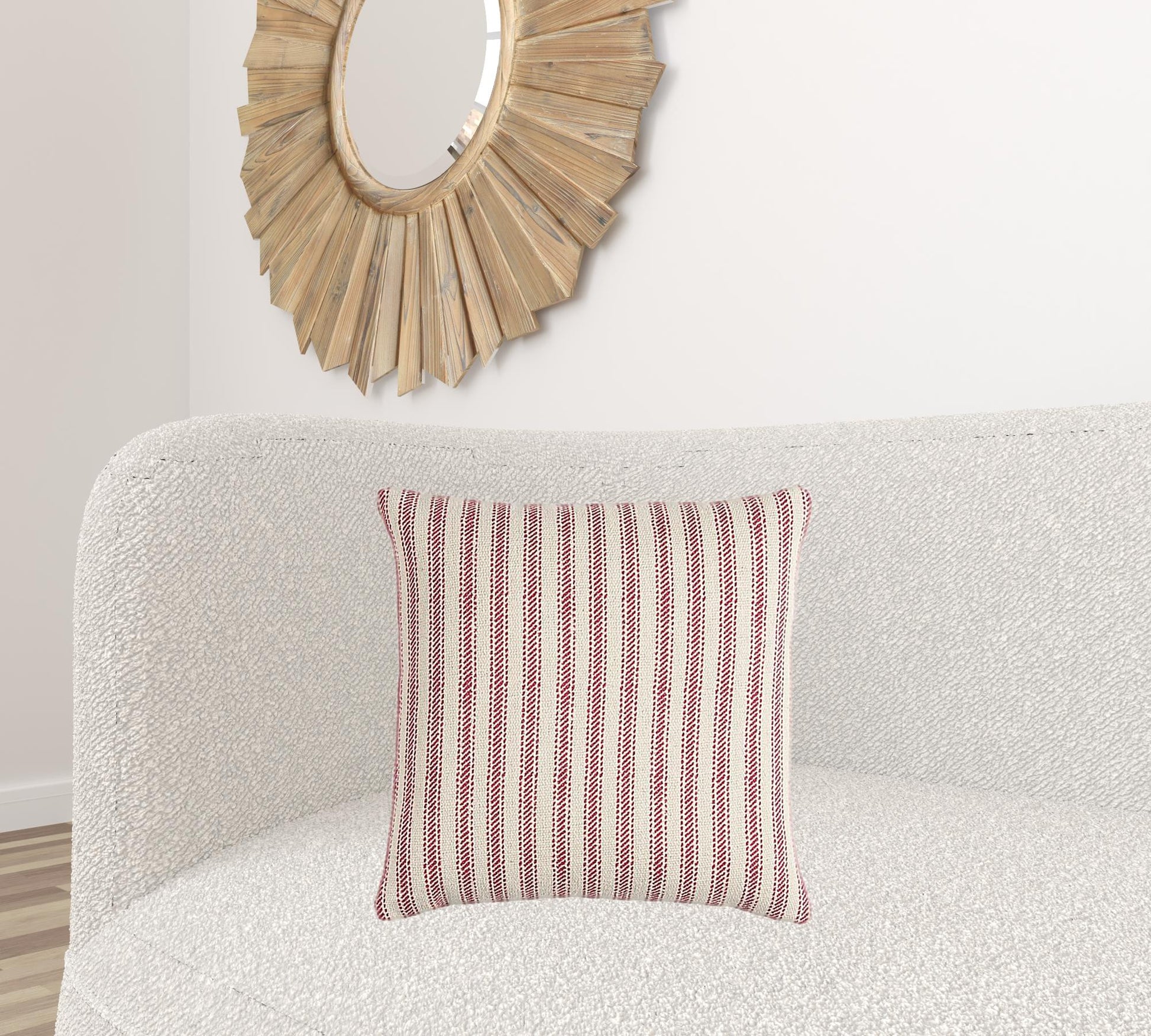 Give your home a relaxed and casual vibe with this Red Natural Ticking Stripe Throw Pillow that works as a wonderful additional piece to any bohemian or transitional decor. The red ticking stripe on the natural beige background brings a comforting contrast to the pillow. Made with top-quality cotton canvas fabric, it offers a light textured surface while ensuring durability to last long. The pillow features solid cotton back with a hidden zipper closure for easy maintenance, and the knife-edge accentuates a sharp and clean appearance. Whether your want to use it as a stand-alone or layering piece, this decorative throw pillow is sure to elevate your interior with a retro-modern appeal. 20” x 20” x 6.25”