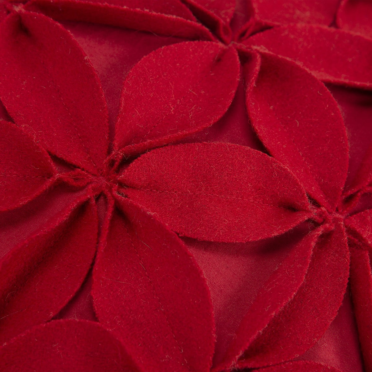 The visually intriguing texture of this Red Pinwheel Floral Petal Throw Pillow will undeniably serve as an eye-catching accent in your living space. The pinwheel floral work is skillfully crafted in a cherry-red tone with intricate machine-stitched detailing on the wool felt petals to keep the shape intact for added dimension to the piece. Ideal for adorning any modern or contemporary home, this pillow is crafted from cotton fabric to ensure a soft hand with long-lasting durability. The solid coordinating back features a concealed zipper closure for ease of washing while the knife edge caters to a clean and sophisticated look. Meant to work well with various genres, this heavily textured throw pillow will set an inviting tone in the room without compromising style and comfort. 18” x 18” x 6.25”