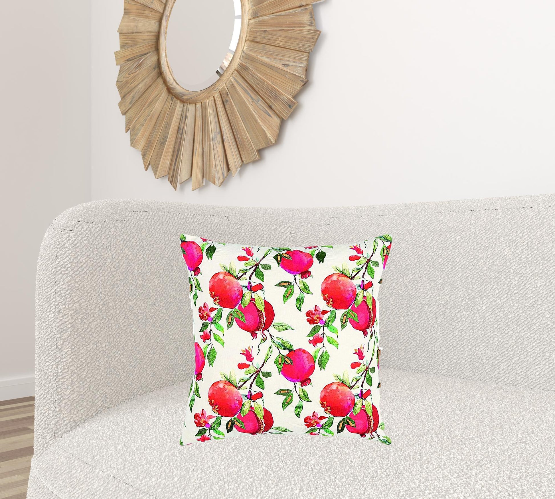 Bring a bright and lively piece of decor into your living space with this Red White Pomegranates Decorative Throw Pillow that will uplift the atmosphere with its vibrant hues and botanical patterns. Packed with pinkish-red pomegranates and bright green leaves and vines on a white base, the pillow is enough to make the guests turn heads while the embroidery and hand-beaded accents add a layer of luxury to the piece. Manufactured with high-grade cotton fabric, it offers durability for years of use and the polyfill insert provides a lavish fluffy feel and super comfort. The knife edging caters to the clean and crisp corners for a polished look. The solid cotton back features a concealed zipper closure for ease of fill and cleaning. Get a vibrant display of colors and patterns with this lovely decorative throw pillow in your modern or transitional home. 20” x 20” x 6.25”