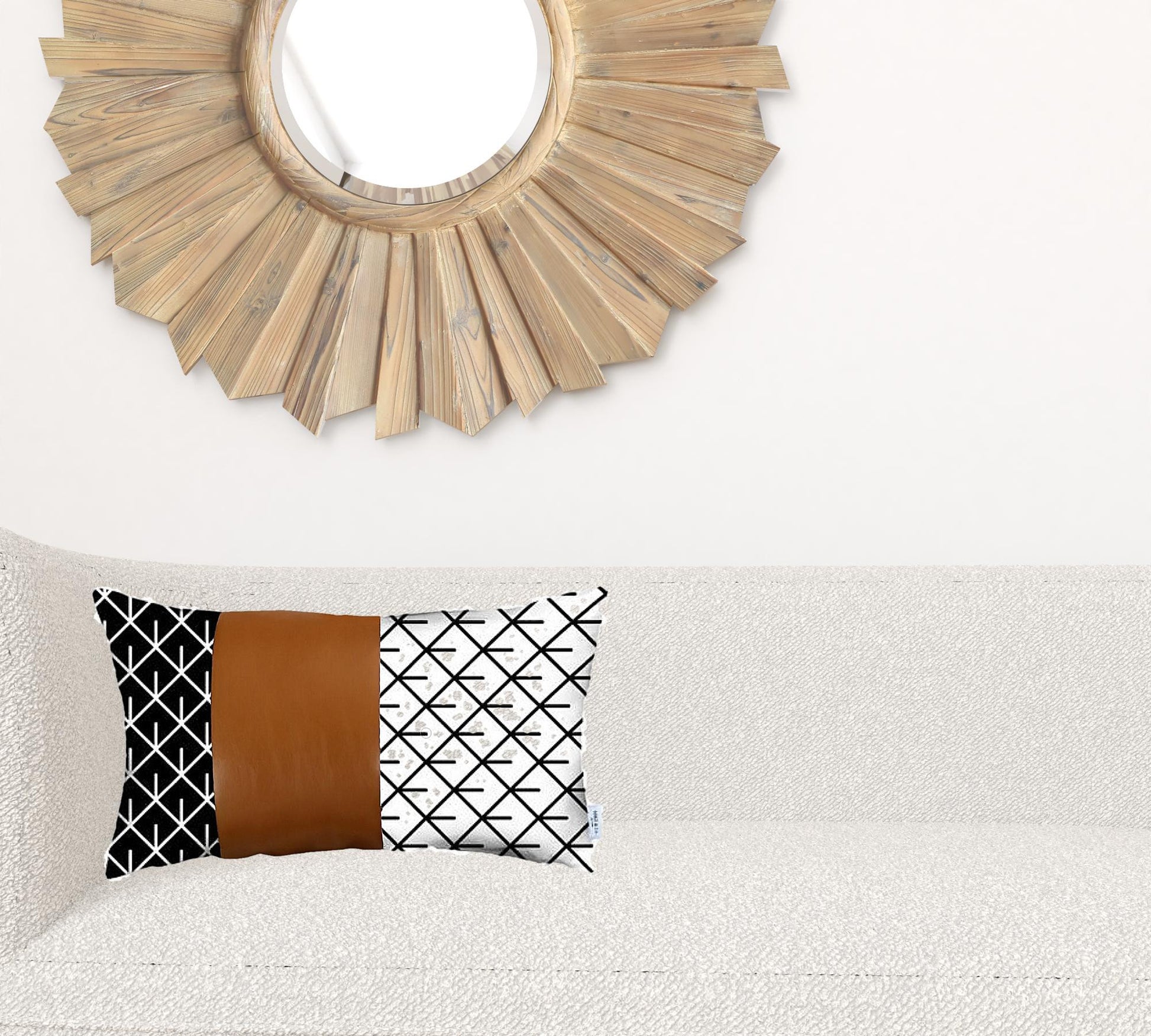 Reverse Black And White And Brown Faux Leather Lumbar Pillow Cover
