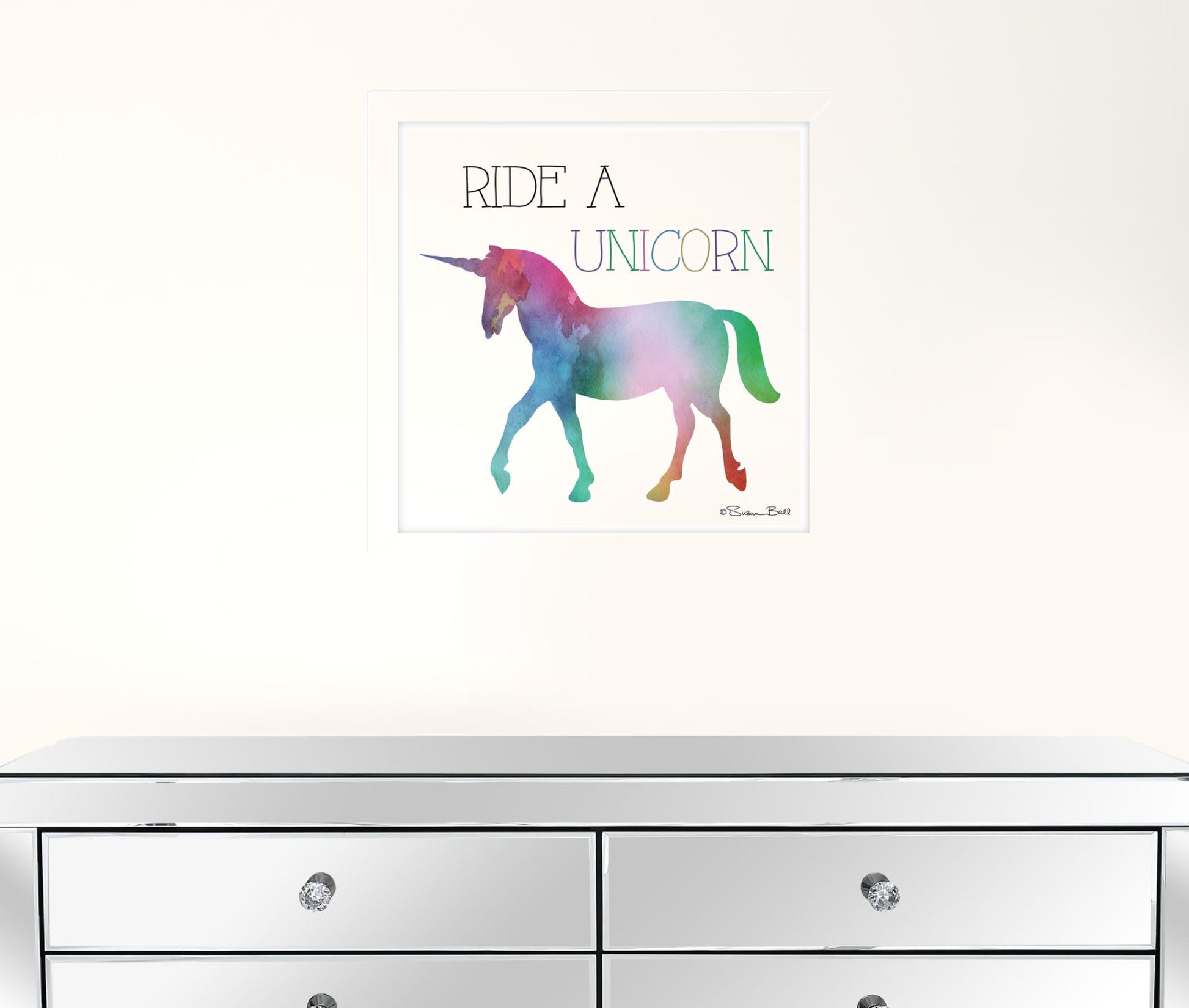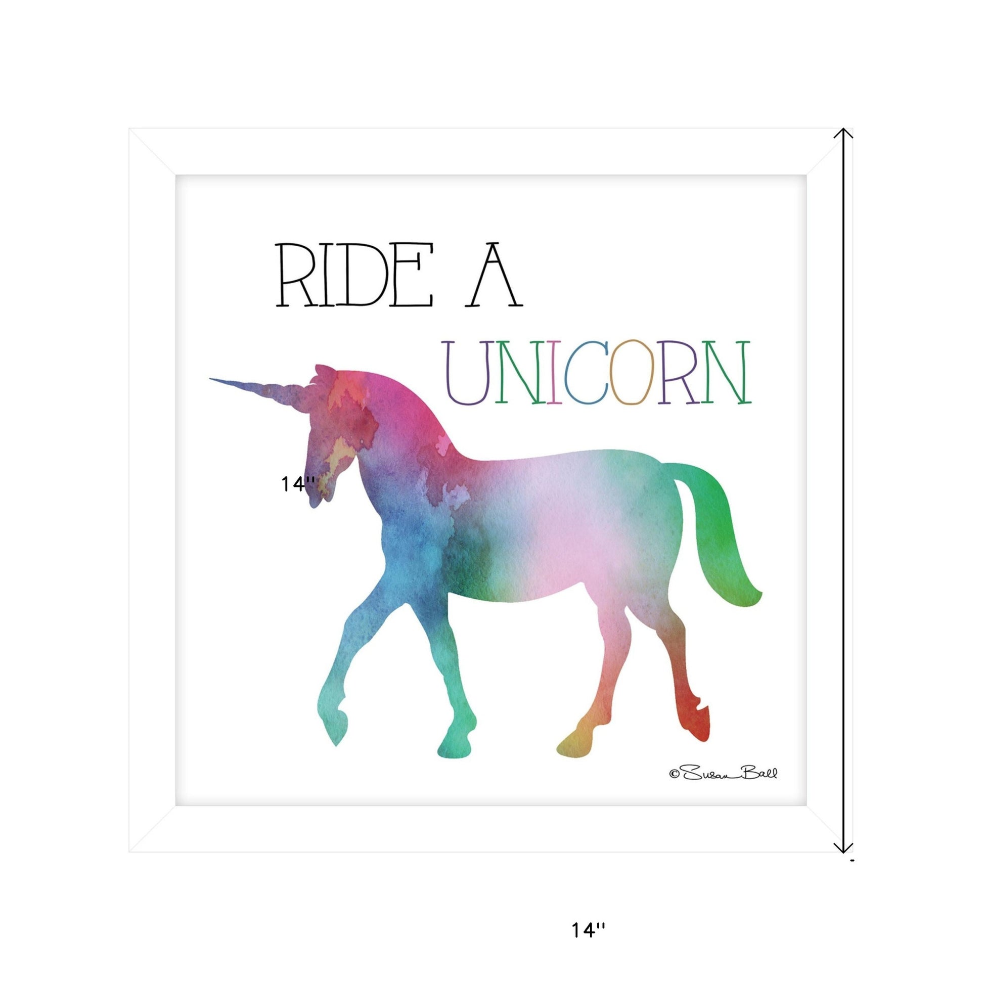 This ride a unicorn white framed print wall art will add a beautiful decorative accent to your decor. This print is a visual artistic expression that allows you to decorate your space in style. Reproduced for you on paper, this hanging decorative accent will be a trendy and fashionable way to dress your walls. Adding this hanging wall art to your space to make your room feel more finished and attractive. Instantly liven up your space with this art that brings color and dimension to your walls. 14 inches H x 14 inches W x 1 inches D