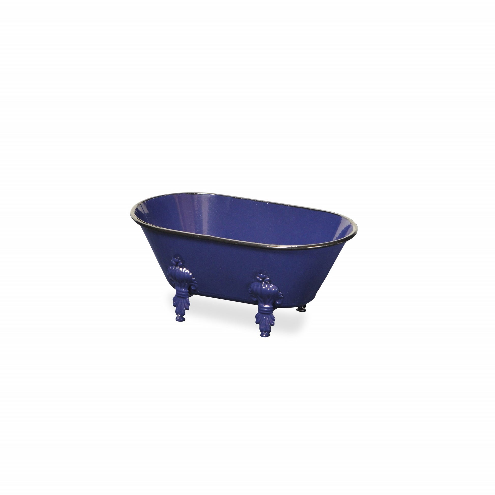 Add a whimsical touch to any space in your home with this Royal Blue Bathtub Decorative Sculpture. This piece is made from solid metal and is colored to a royal blue finish. The claw foot bathtub shape has a black colored rim and four feet underneath which add a nice depth to the overall look. You can use this piece as decor around your home or you can line in with plastic and use it as a fun planter outdoors or indoors. 4.5" H x 10" W x 5.5" D