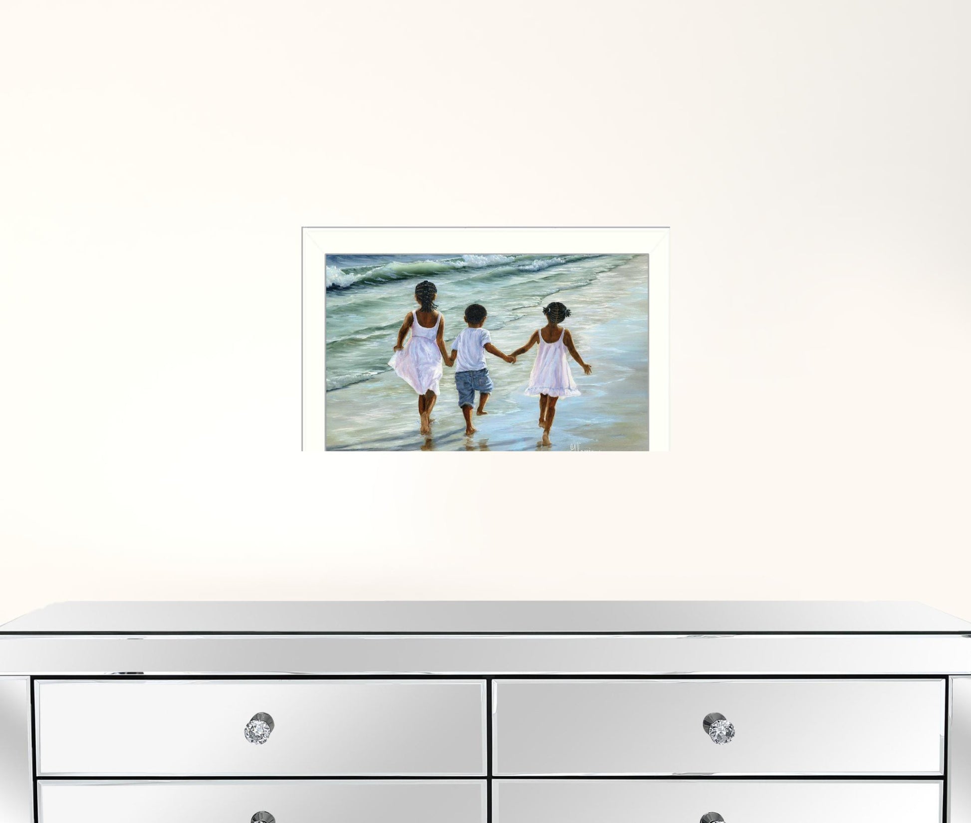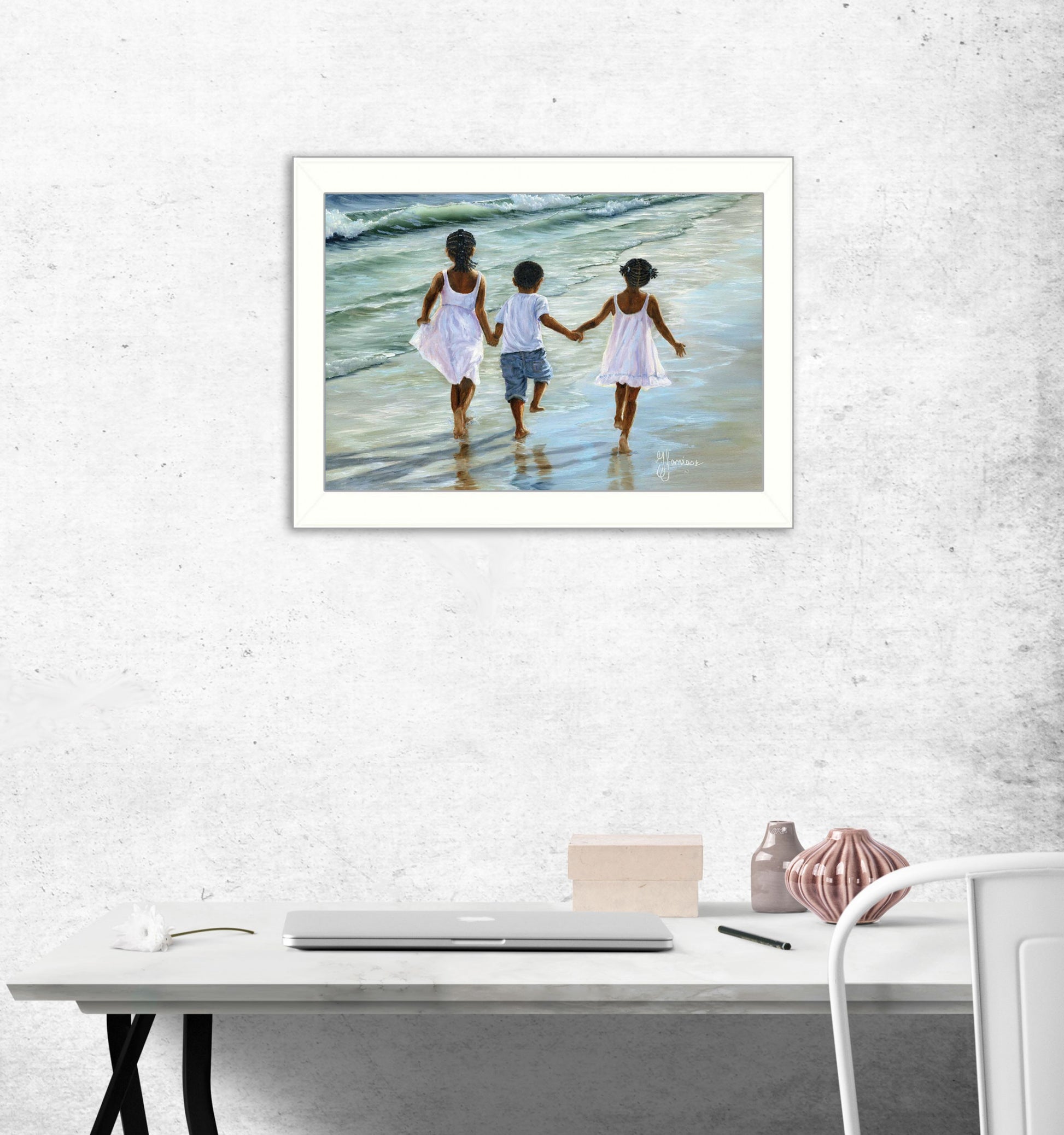 Bring some sizzle to your space with this eye-catching running on the beach 1 white framed print wall art. This print is a visual artistic expression that allows you to decorate your space in style. Reproduced for you on paper, this hanging decorative accent will be a trendy and fashionable way to dress your walls. Hang on your wall to add some up to date fashion and decoration. Instantly liven up your space with this art that brings color and dimension to your walls. 10 inches H x 14 inches W x 1 inches D