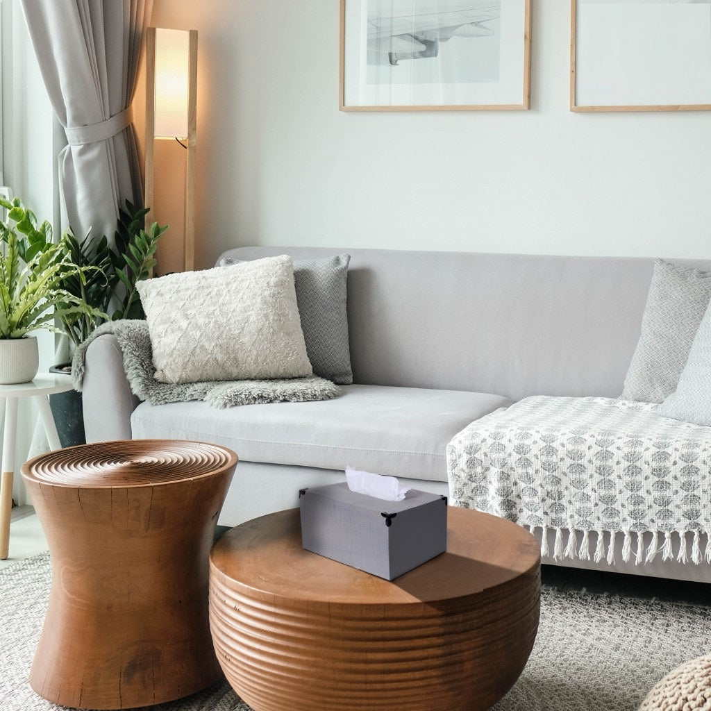 Literally change the way you see tissue boxes with this updated farmhouse chic Rustic Gray Mango Wood Rectangular Tissue Holder. Say no more to those unsightly cardboard tissue boxes on your counters, tables and desks. Upgrade to this great looking handmade decorative wood tissue box cover that will elevate your space. Our distressed gray finish wood tissue box cover is handmade from sustainable Mango wood that is eco-friendly, accented with black metal corner details, and can be used for years to come. Fits most rectangular tissue boxes - even the smaller ones. When the box is empty, you can easily slide out the bottom panel to restock it. Tissue Box Holders create an ideal gift for your friends and family who love to keep everything in order. 6.4" x 10.2" x 4.5"