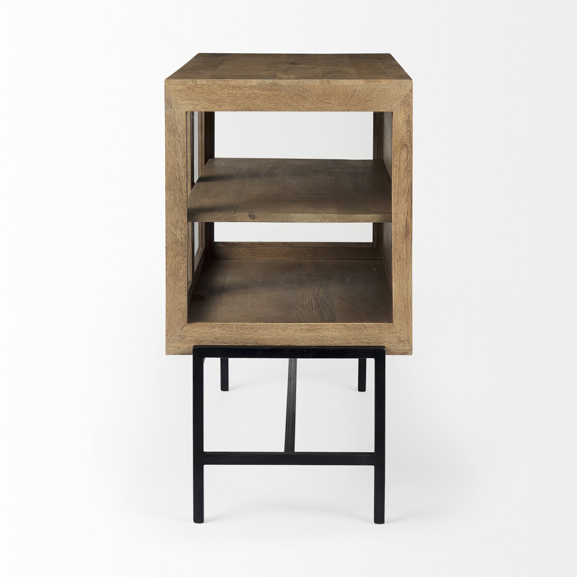 This Rustic Honey Brown Two Door Shadowbox Cabinet will be the perfect addition to your home. The overall style of this double door hand-crafted cabinet is updated modern and minimal but with a rustic feel. The body of this unique cabinet is made from solid wood and features 4 glass panels giving you visability to the cabinets shelves and contents. There is a single shelf inside that provides ample storage or display opportunities. The metal base and matching door handles offset the tone of the wood and add to it's eye catching nature. The wood is stained with a beautiful warm honey brown natural grain finish and the metal base is black. With this double door cabinet you can not only add a smart storage solution to your home but also bring in a contemporary design element. You can use this cabinet anywhere in your home as great storage or even as a small buffet or sideboard for serving. 27" H x 38" W x 22" D