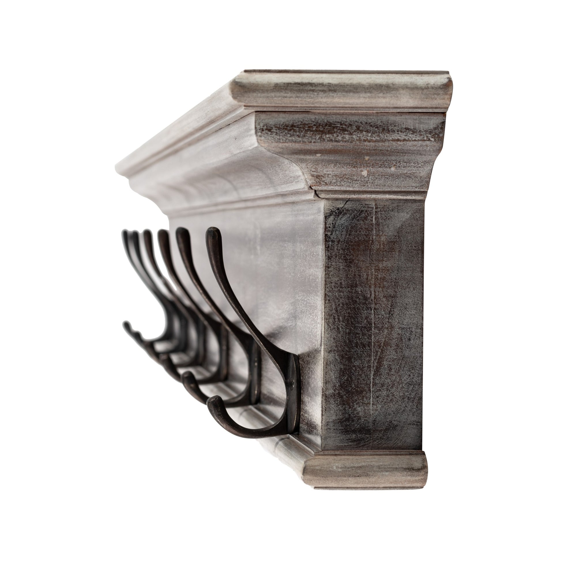 Elevate your home with this aptly designed Classic Wood Six Hook Hanging Coat Rack. Handcrafted from mahogany wood, with six large antiqued brass hooks, the rack has a whitewash rustic finish over natural brown wood. Creatively fashioned with crown molding design details, the top of the rack has just the right amount of space to display decorative artifacts or even a family photo. The large multipurpose durable hooks are built to support coats, hats, keys and even handbags. Add some stylish organization to your home with this classic and traditional coat hook rack. 7.87" x 39.37" x 3.94"